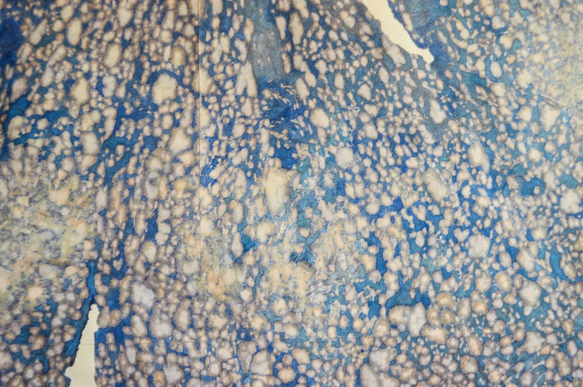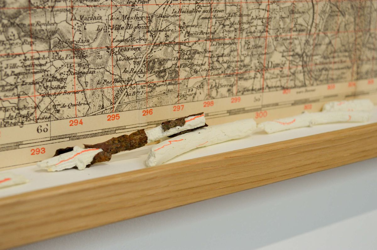 Carte ancienne, moulages en plâtre, écorce, acrylique, 66 x 43 cm