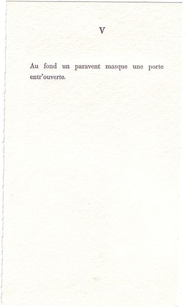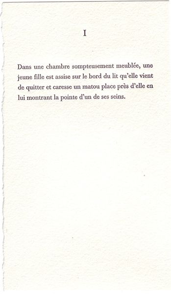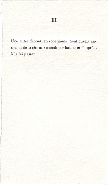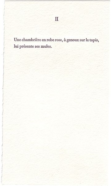 Les cinq courts textes, transformés en chapitres déchirés d’un livre, proviennent d’un catalogue de la vente aux enchères de gravures d’après une peinture de Pierre-Antoine Baudouin, le gendre de Boucher, qui, comme son beau-père, dépeint le voluptueux érotisme de l’Ancien Régime. La servante à genoux devant sa maîtresse, tenant sa mule en satin.
