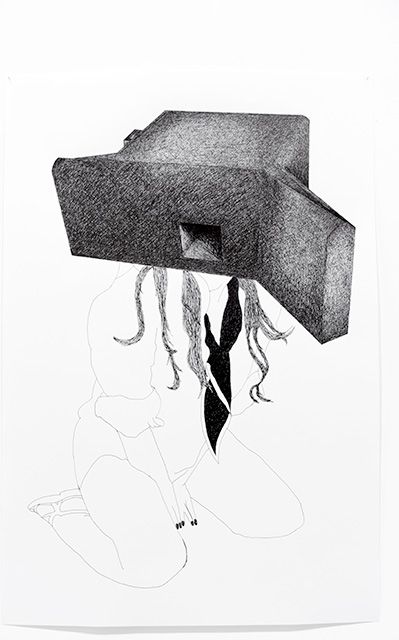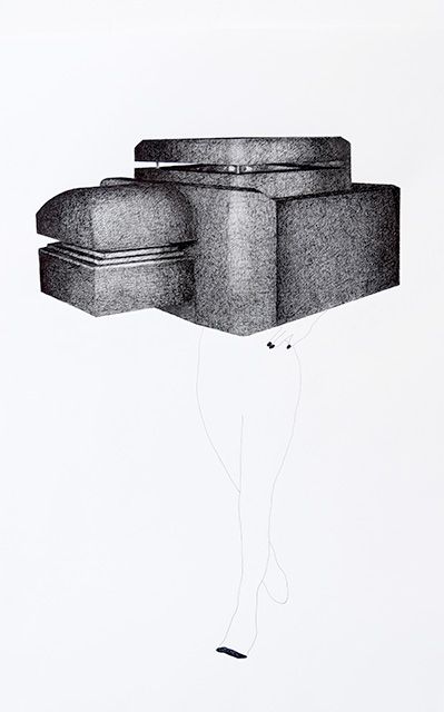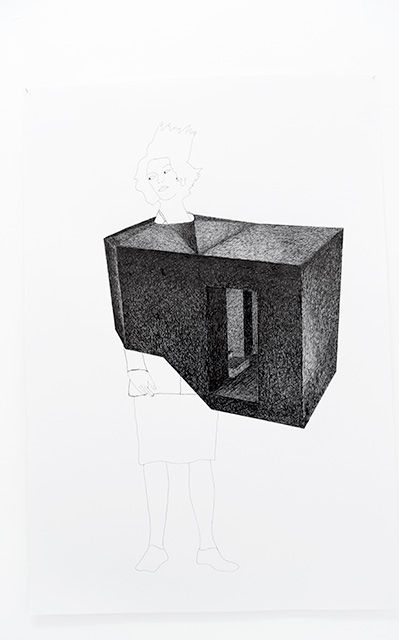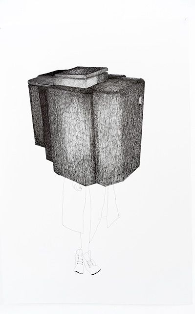 Je propose une analogie entre le blockhaus, cette architecture fonctionnelle construite durant la seconde guerre mondiale suivant une typologie précise et standardisée, et l’unification du corps des femmes par le port de vêtements standards. La fente presque omniprésente dans les blockhaus offensifs ou défensifs rappelle la fente des yeux des vêtements recouvrants la tête. Les bunkers m’ont aussi intéressé car ils sont devenus aujourd’hui des objets « décoratifs » dans le paysage du littoral de Atlantique. Pour cette pièce, j’ai voulu fabriquer des maquettes à partir d’un choix de dix blockhaus avec un niveau de finition permettant d’obtenir des objets élégants, raffinés et portables. Les dix éléments que j’offre à porter lors d’une performance/défilé intitulée « Prêt-à-porter », sont à la fois des instruments de guerre et des vêtements qui contraignent le corps. Disposés dans l’espace d’exposition sur des portants, ces éléments attendent d’être activés comme dans un vestiaire.