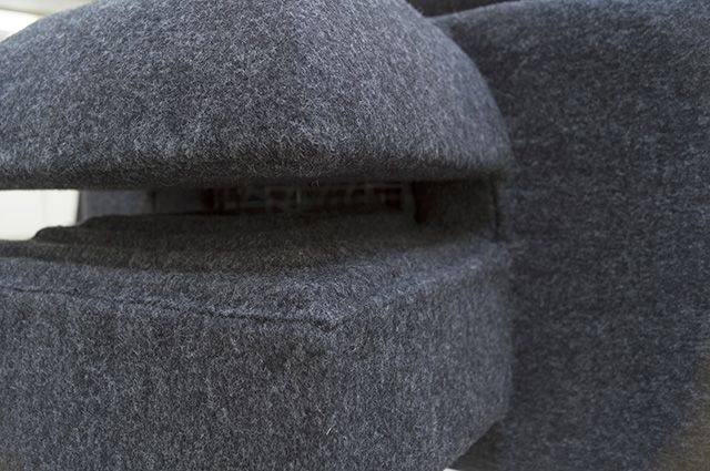 Portés par des danseurs, ils rendent anonyme le corps tout en lui donnant un pouvoir de menace. La matière en feutre, douce, isole et protège le corps de l’extérieur, élégante à l’extérieur, elle parade devant le spectateur lors du défilé. Un maître de cérémonie annonce chaque modèle dans un vocabulaire technique, ce qui crée un décalage entre le spectacle frivole du défilé de mode et la brutalité des formes. De retour dans l’espace d’exposition la vidéo de 35 minutes de la performance réalisée le 7 mars 2012 prend place comme témoin de cette activation.