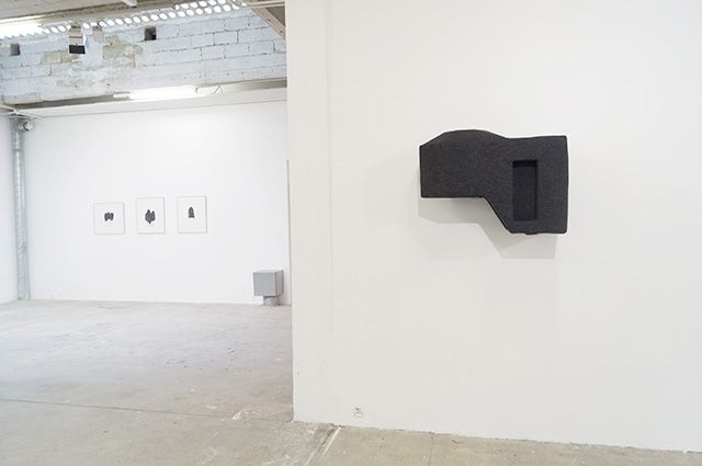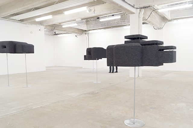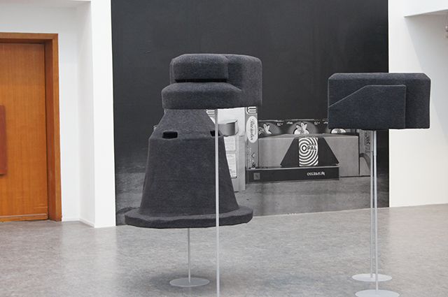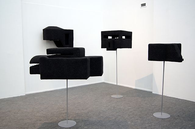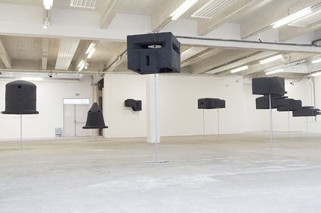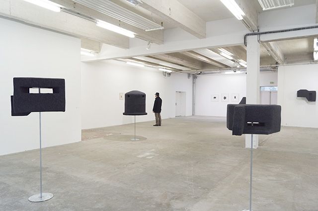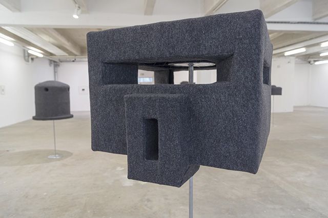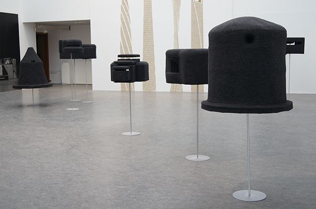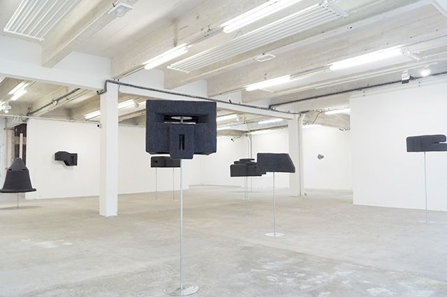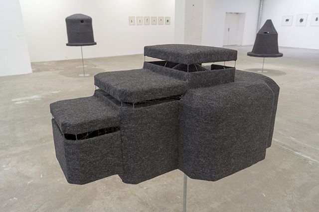 10 formes, feutre, métal, support en métal dimensions variables : de 1m60 de hauteur à 1m10 de largeur. Vue de l’exposition Monument, Musée des Beaux-Art de Calais, 2014. Photo : Sylvie Ungauer
