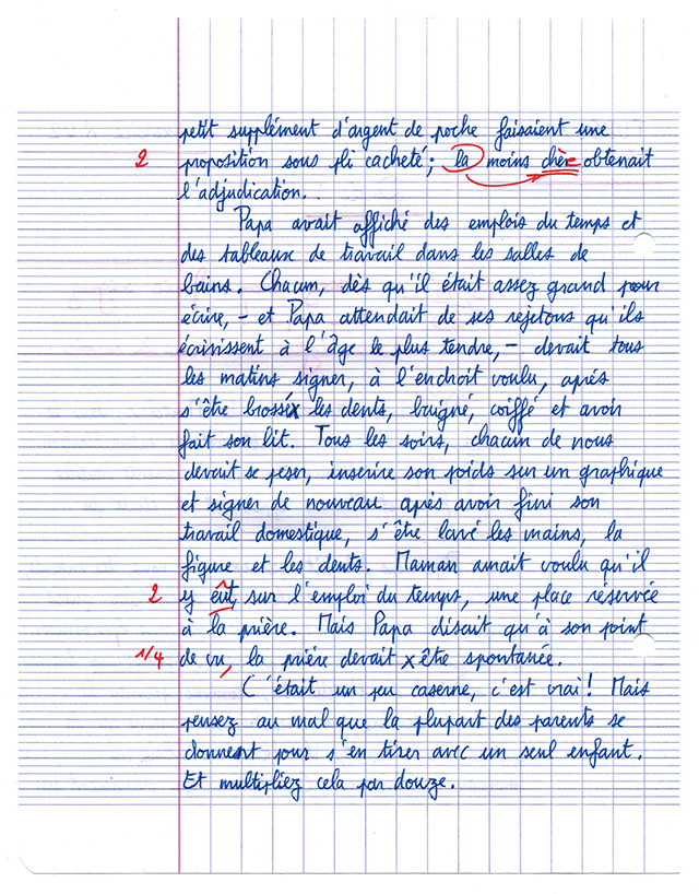 Thomas Tudoux a invité, pendant 9 mois, 52 instituteurs amateurs à lui dicter l’intégralité du roman jeunesse Treize à la douzaine de Frank et Ernestine Gilbreth. L’ouvrage raconte la jeunesse de 12 enfants élevés par un père spécialiste du rendement qui considère que tout ce qui est bon à l’usine est bon à la maison et réciproquement. Le titre de l’installation 14,75/20 est sa moyenne générale sur l’ensemble de ces 272 dictées. Les copies sont présentées sous forme d’une installation qui plonge le visiteur dans un espace imprégné de souvenirs d’enfance, de répétition, de cadence et d’évaluation.