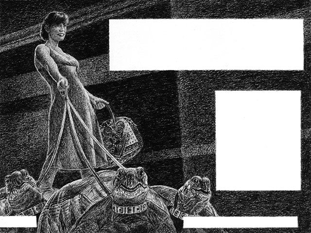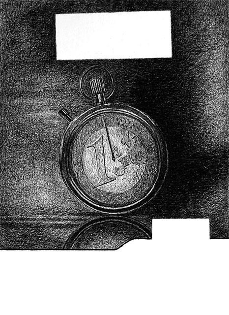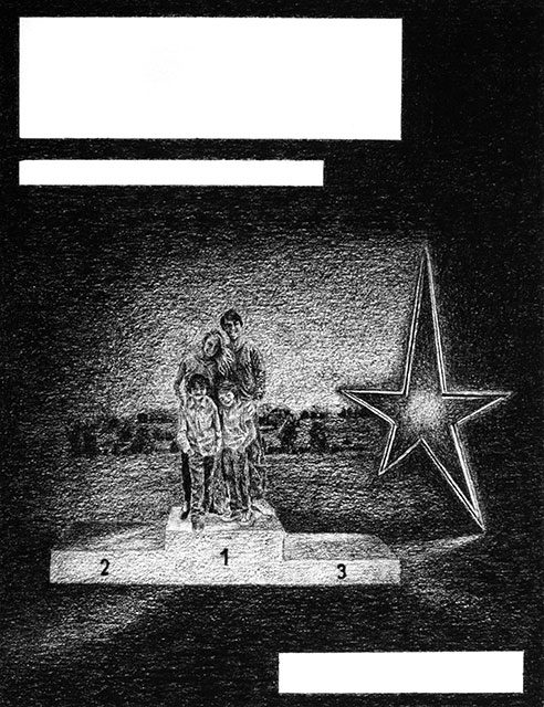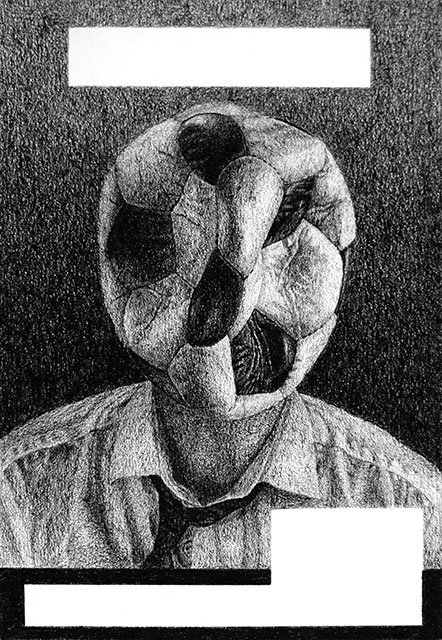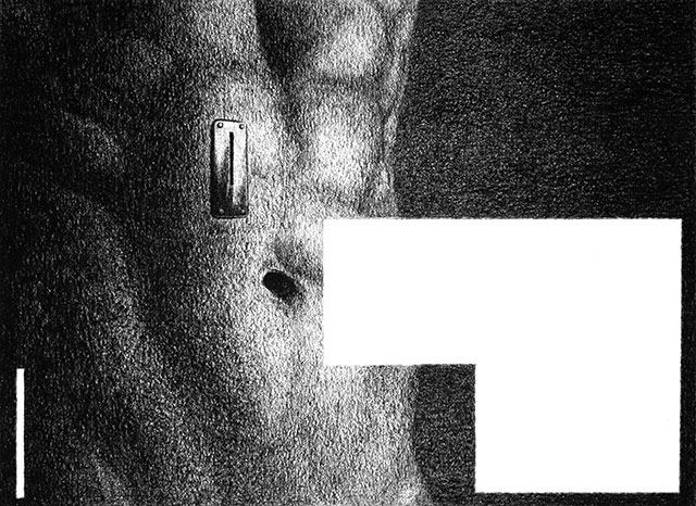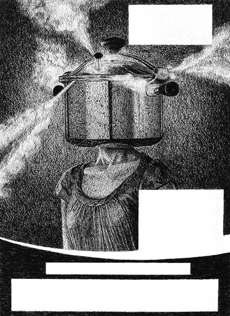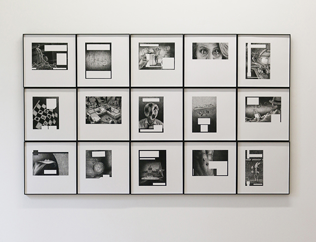 Le caviardage des slogans met en avant les assemblages d’images tandis que leur reprise en dessin à la pierre noire les plonge dans un clair-obscur énigmatique. Ces compositions imaginaires semblent dès lors présenter notre inconscient collectif en prise, lui aussi, avec cet impératif d’efficacité.