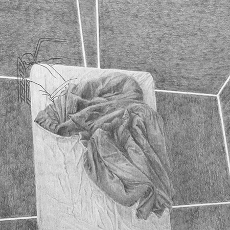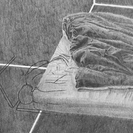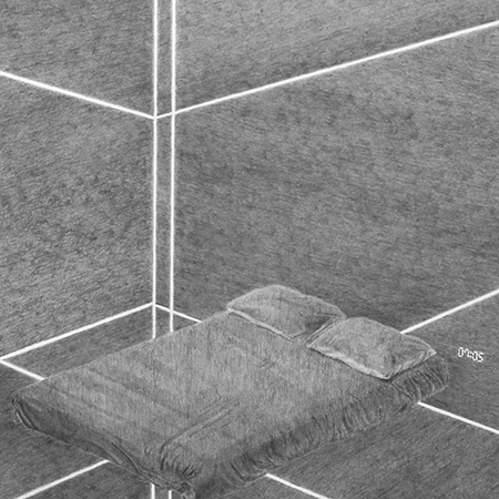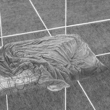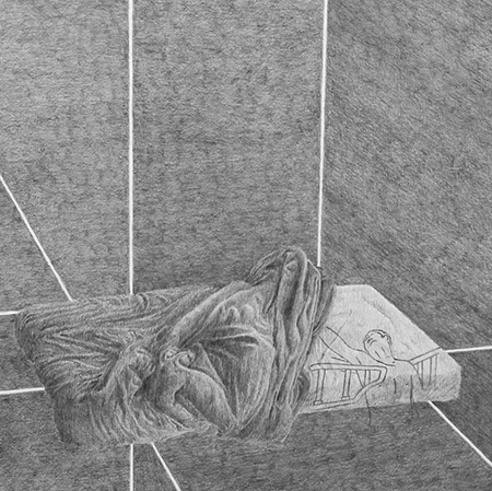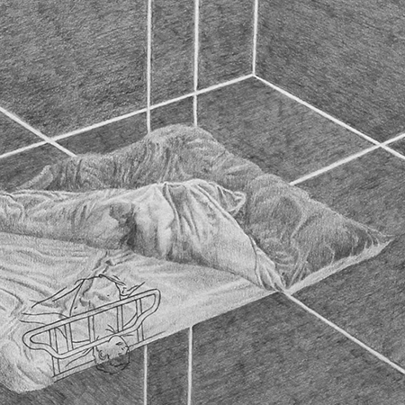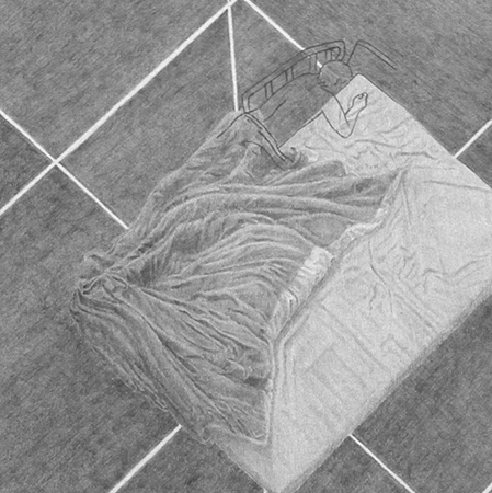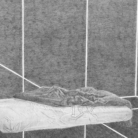 Dans cette série de huit dessins placée dans les vitrines, une chambre est modélisée sous différents angles et encadre un lit, comme une cellule qui isole l’individu. L’ambivalence se joue dans la tension entre la sensualité des drapés et l’effroi du lit médicalisé.