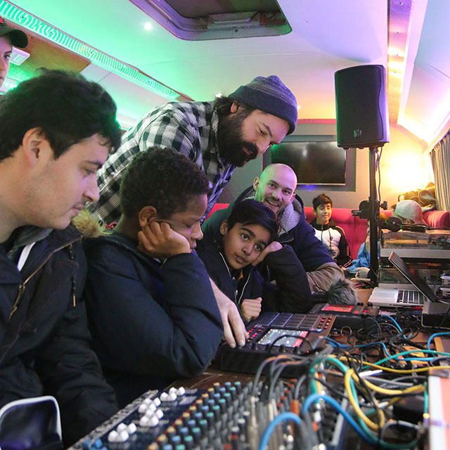 Les habitants des quartiers doivent s’inscrire. Il y a un tableau sur le bus avec des créneaux horaires. Mais la jauge est limitée. Sinon et c’est déjà prévu, il y a des écoles qui participent aussi, à raison d’un groupe de 6 à 7 élèves : pour qu’ils soient à l’aise pour utiliser les machines et pouvoir composer.