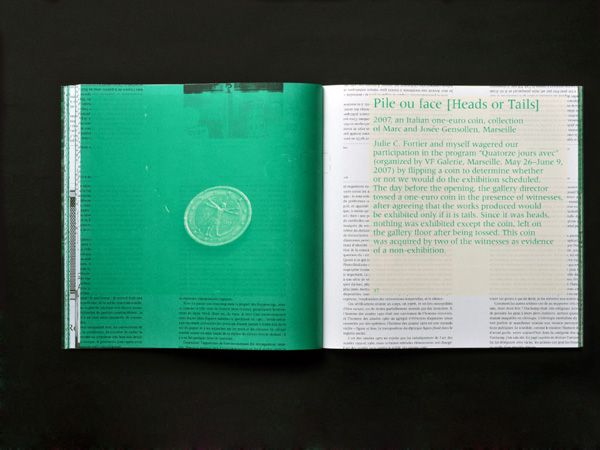 Dans le volume 2 de l’ouvrage Du Yodel à la physique quantique…, qui retrace d’une manière encyclopédique la programmation 2008 du Palais de Tokyo, les photographies de Marc Domage documentant mon exposition furent malencontreusement remplacées par d’autres, prises lors du constat du vol des ouvrages constitutifs de l’œuvre. La reproduction photographique de cette étourderie éditoriale fut proposée aux Amis du Palais de Tokyo sous la forme d’une édition limitée accompagnant l’Édition fantôme (éditions Christophe Daviet-Thery, Paris) destinée à contenir la présente publication.