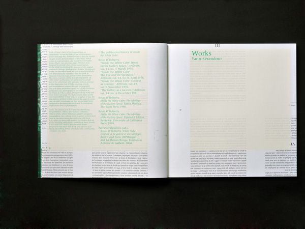 Ce catalogue fonctionne comme un palimpseste : construit sur la première publication en français de l’ouvrage canonique de Brian O’Doherty Inside the White Cube (L’espace de la galerie et son idéologie, JRP|Ringier, collection Lectures Maison Rouge), il laisse entr’apercevoir le texte et sa mise en page, tout en lui superposant des reproductions et des commentaires du travail de Yann Sérandour.