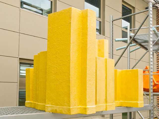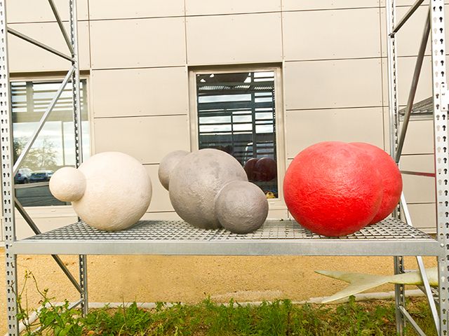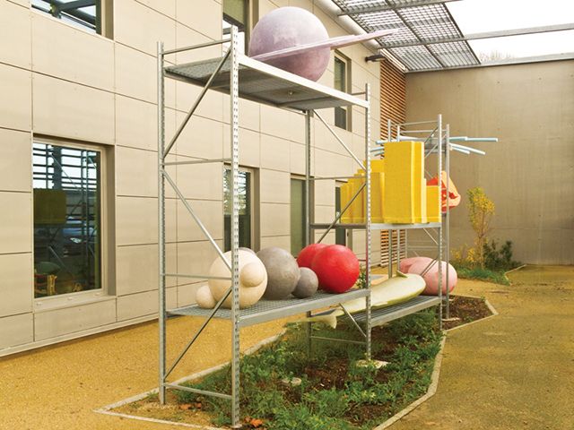 Etagères en acier galvanisé, sealer acrylique, Jesmonite, pigments, polystyrène expansé. 440 x 300 x 80 cm, 220 x 300 x 80 cm.