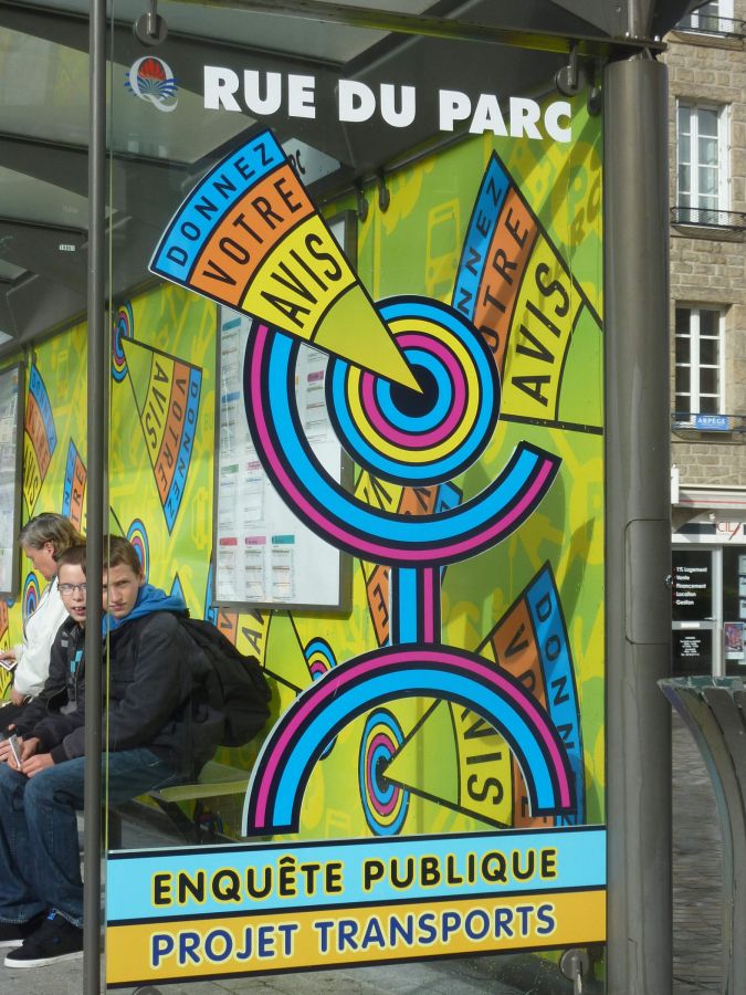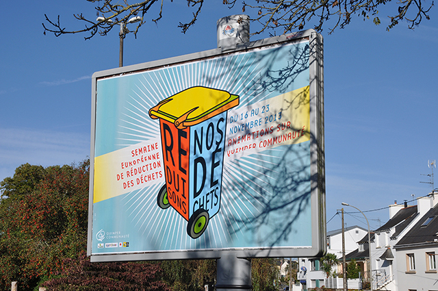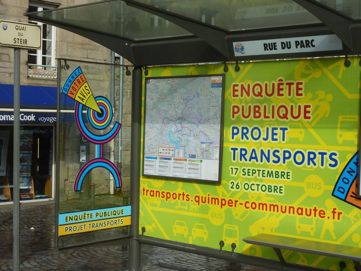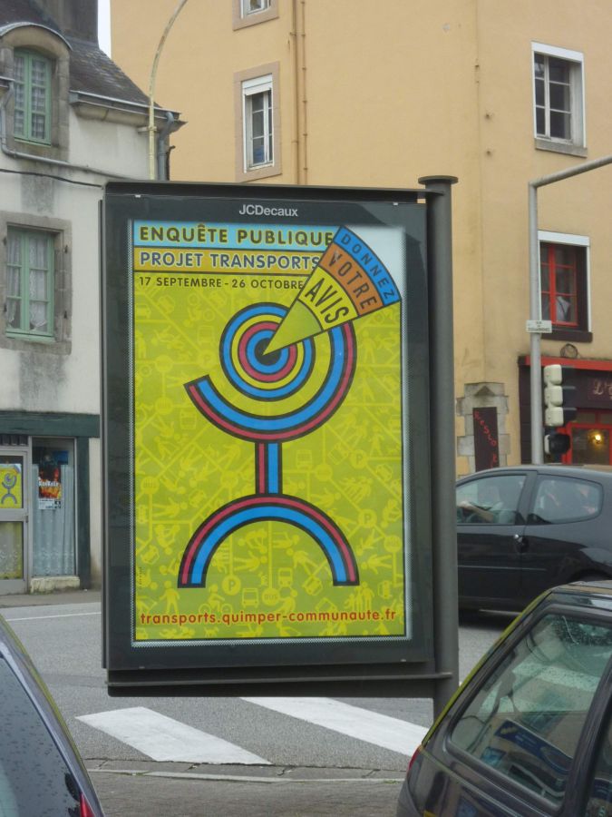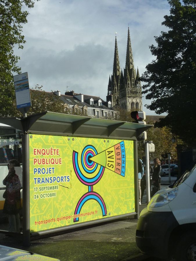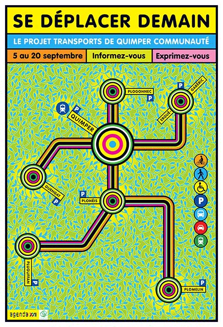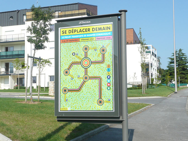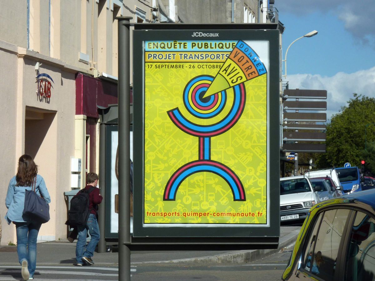 ALQ : L’un des grands chantiers de la nouvelle équipe communautaire est certainement son projet transports. Modifier les habitudes de transport et de déplacement n’est pas facile, c’est pourtant une nécessité pour toutes les villes. À Quimper Communauté la mise en place du projet s’accompagne d’un gros effort de communication. Ce travail s’inscrit dans la durée, la ligne graphique créée pour la première campagne est conservée et déclinée d’année en année pour les différents thèmes abordés. Les communications intercommunales, le schéma vélo et l’enquête publique.