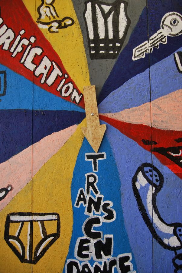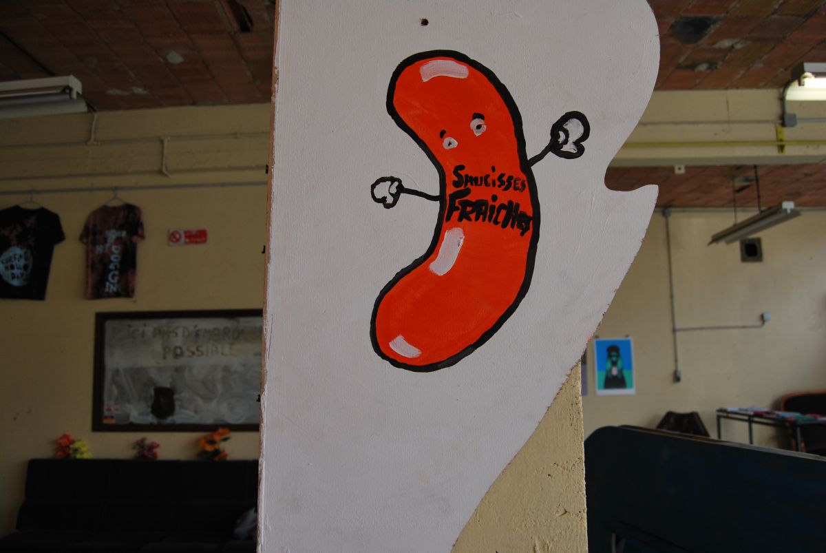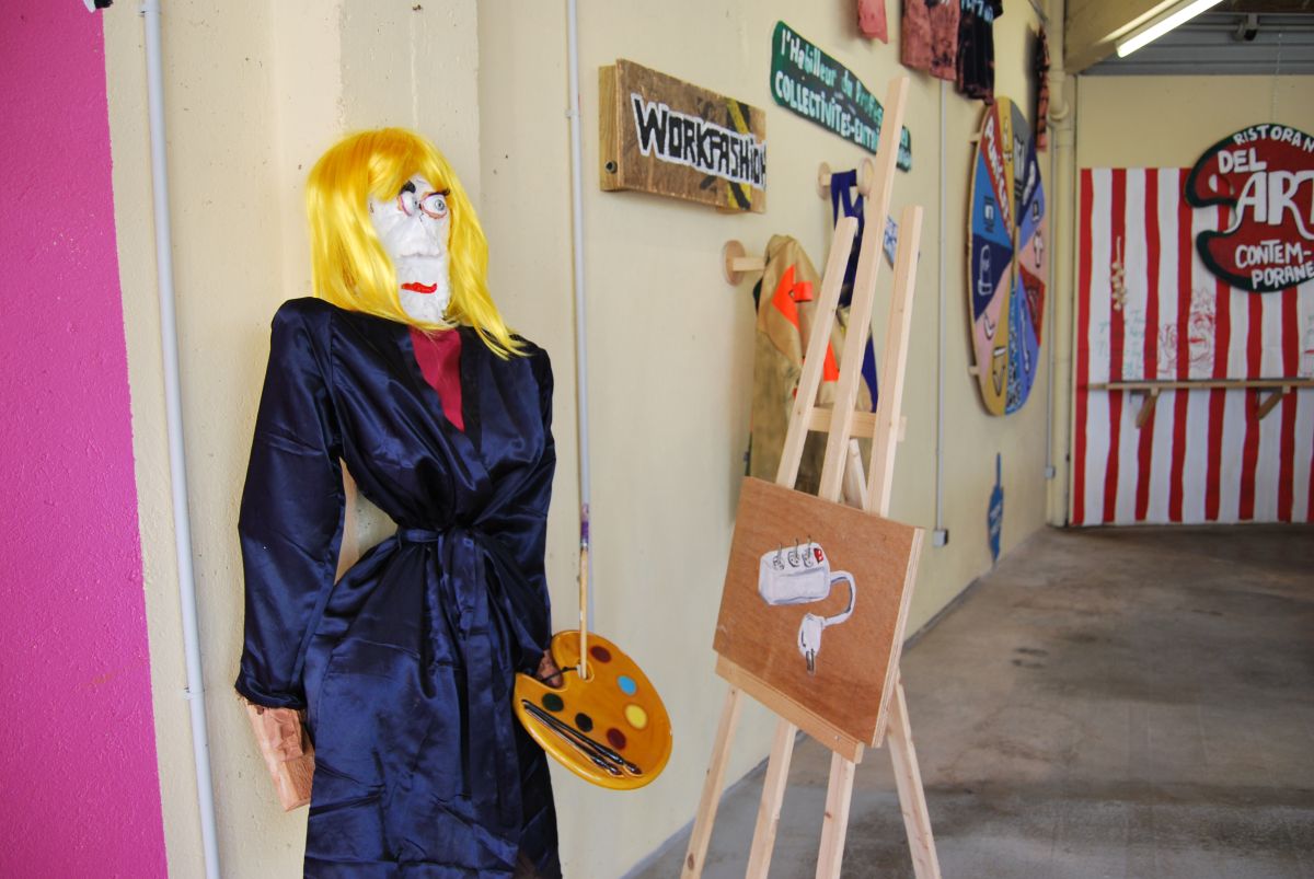 Dans cette exposition, de véritables frigos, télévisions et canapés dialoguent avec des objets en bois réalisés par l’artiste. Une grande roue de la fortune nous invite à la transcendance, tandis que la pizzeria nommée « ristorante del arte contemporaneo » propose sur des plateaux des pizzas à visages humains. Entre bricolage et sculpture, les objets ne font pas semblant ; le mimétisme est flagrant tout en gardant la simplicité du geste. La valeur attribuée aux objets de seconde main, l’économie du bricolage, le détournement et de recyclage ne sont ici pas anodins. Tout est produit sur place ou récupéré aux alentours pour redonner vie au lieu. Dans cette profusion de produits et de services proposés, Anaïs Touchot n’ajoute pas d’objets au monde.