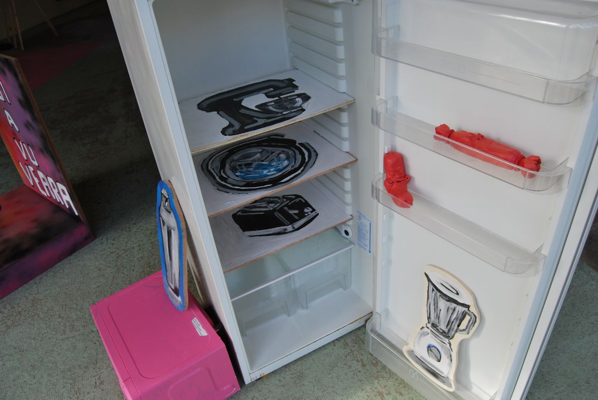 Arbres magique saveur vanille et citron, bois de récupération, canapés, cage à hamsters, chaînes, curly, fontaine cascade, fleurs artificielles, frigidaire, magnets, micro-ondes, mixeur, mugs, sous vêtements en plâtre, vases, plantes vertes, peinture, plateaux de self-service, pièces de monnaies, poubelle, sculptures en pâte auto-durcissante, télévisions, t-shirts, vêtements de travail