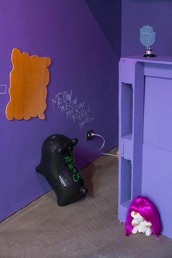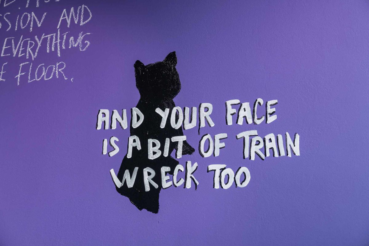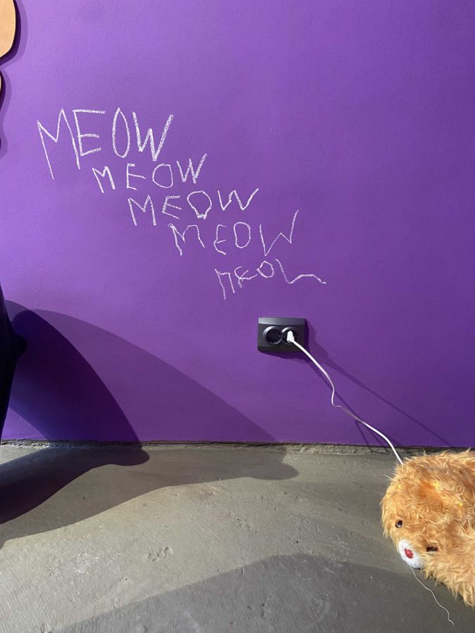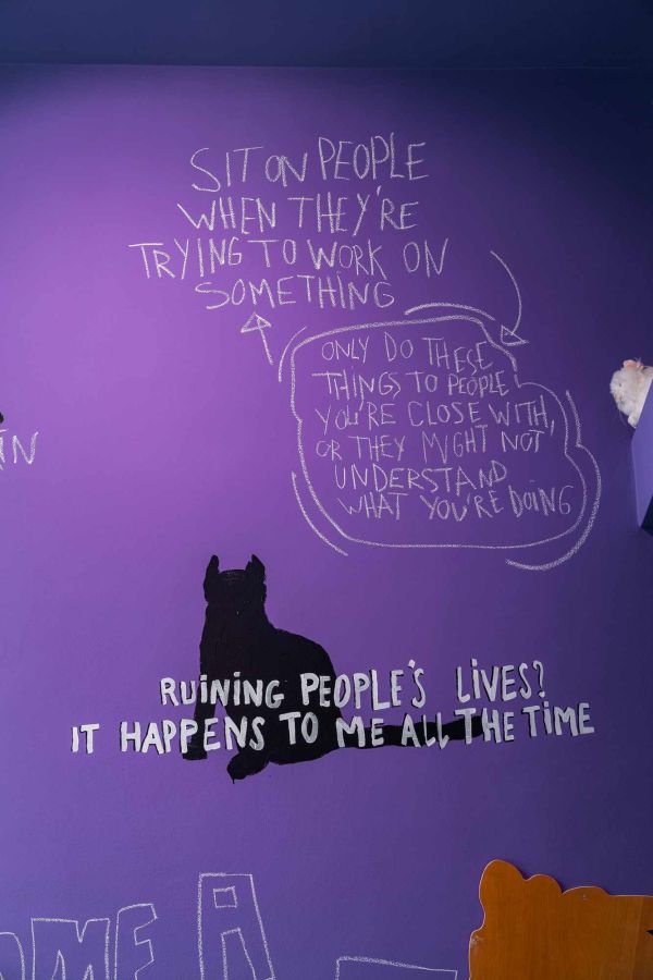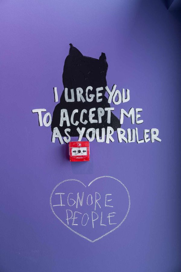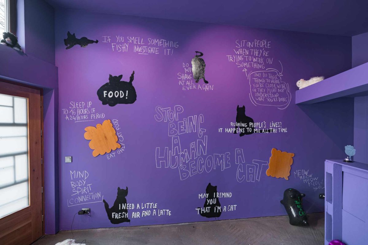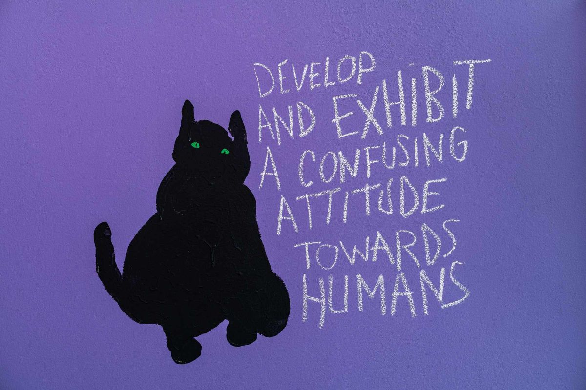 Dans un garage, Le Caress Bar s’ouvre comme un espace de liberté et de dérive, une zone de transformation où j’invite les humains à accéder à leur part animale, féline, simplement en adoptant les attitudes sociales du chat. Ici, il ne s’agit pas de se déguiser, mais de devenir chat par le comportement, par le détachement, la désinvolture, l’arrogance tranquille. Sur les murs, les injonctions à “devenir chat” se déploient sous forme de peintures et de silhouettes de chats noirs. Certaines reprennent les répliques irrévérencieuses du personnage de Salem, le chat sarcastique de la série Sabrina, l’apprentie sorcière des années 1990 : “RUINNING PEOPLE’S LIVES? IT HAPPENS TO ME ALL THE TIME” - « FOOD! » - « I NEED LITTLE FRESH AIR AND A LATTE » …Leur humour grinçant souligne le caractère provocateur, égoïste et jouissif du chat, figure à la fois méprisante et séduisante. À côté, d’autres phrases tracées à la craie, inspirées de tutoriels en ligne façon WikiHow (“Do not shave ever again”, “Sit on people when they’re trying to work on something”), dessinent une méthodologie absurde de la transformation : devenir un chat, c’est désapprendre la politesse, revendiquer l’oisiveté et la domination.