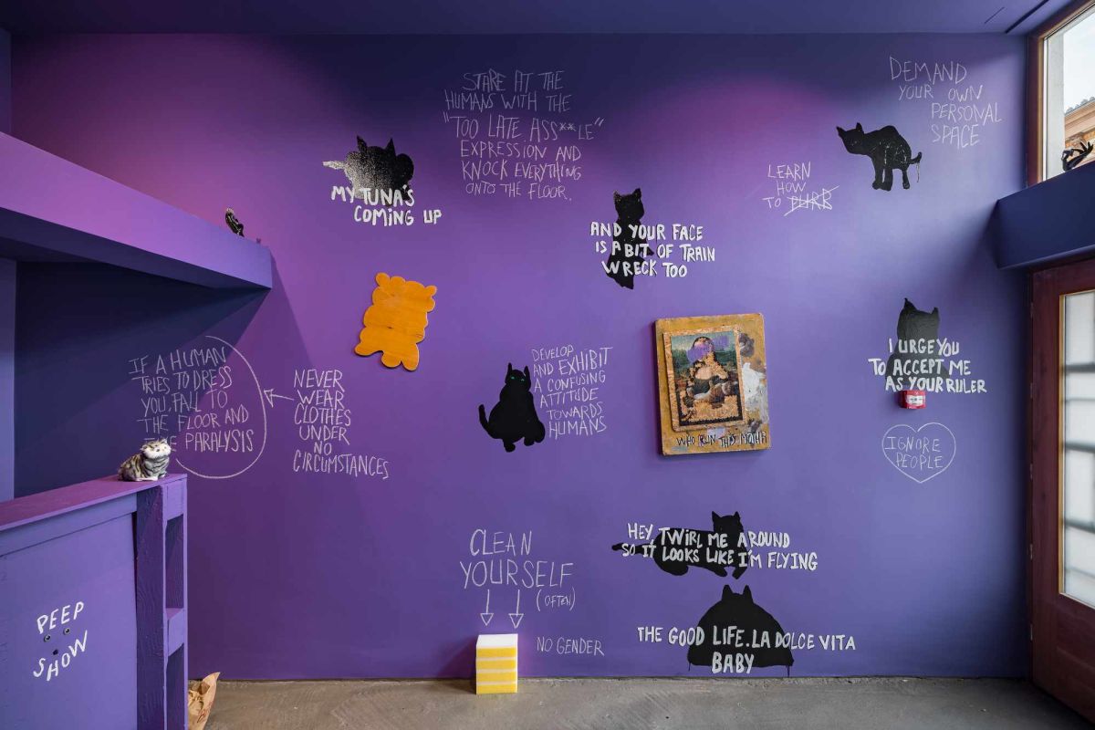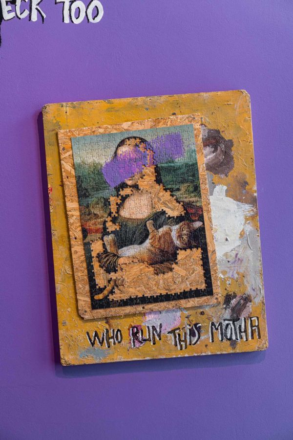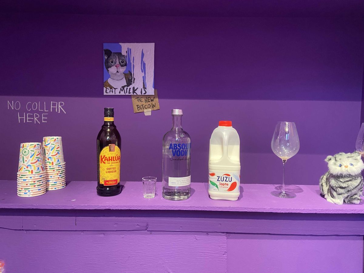 Au bar, on ne sert que des White Russians, un cocktail à base de lait, vodka et liqueur de café. Un puzzle de la Joconde, bon marché, montre la figure emblématique de Léonard de Vinci berçant un chat, surmontée de l’inscription peinte à la main : “Who runs this motha world…” empruntée à Beyoncé, rappelant avec ironie que les chats règnent sans partage sur notre imaginaire et nos foyers.