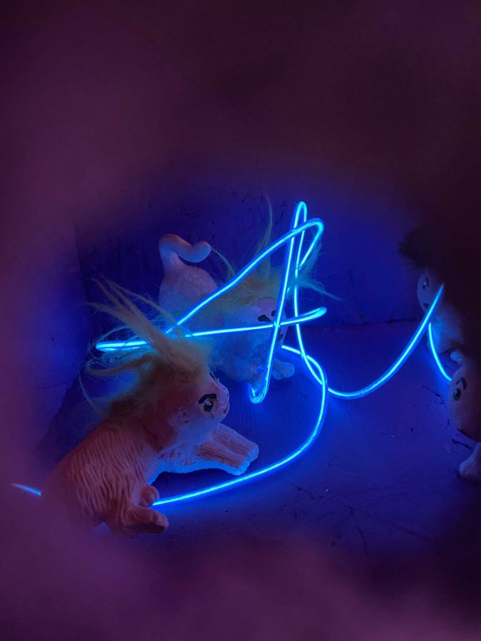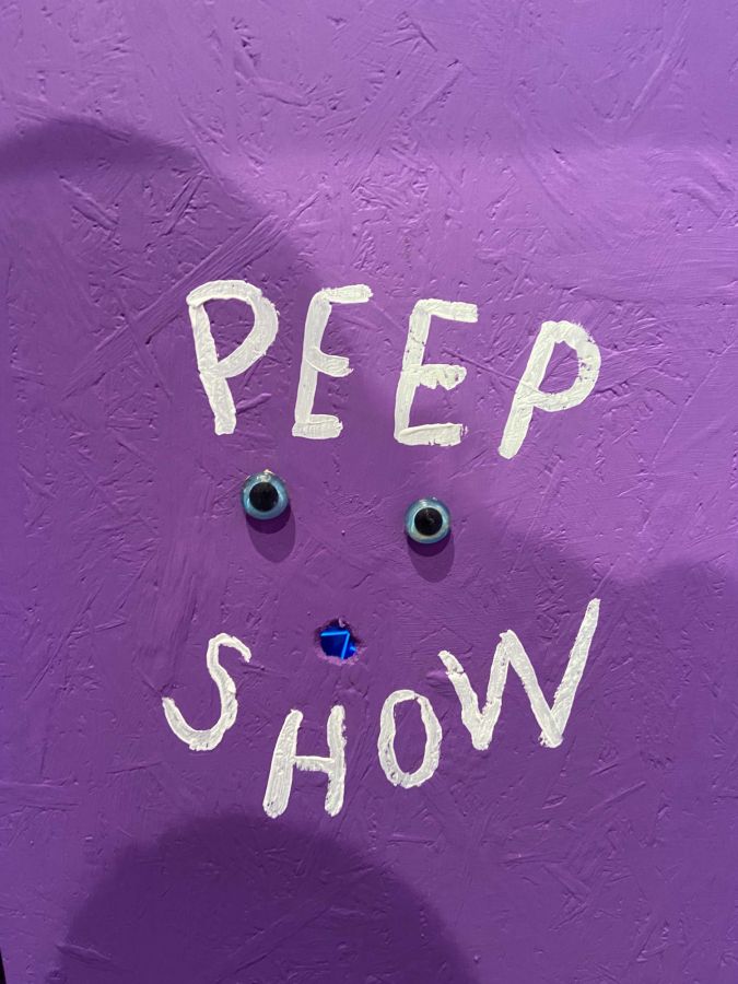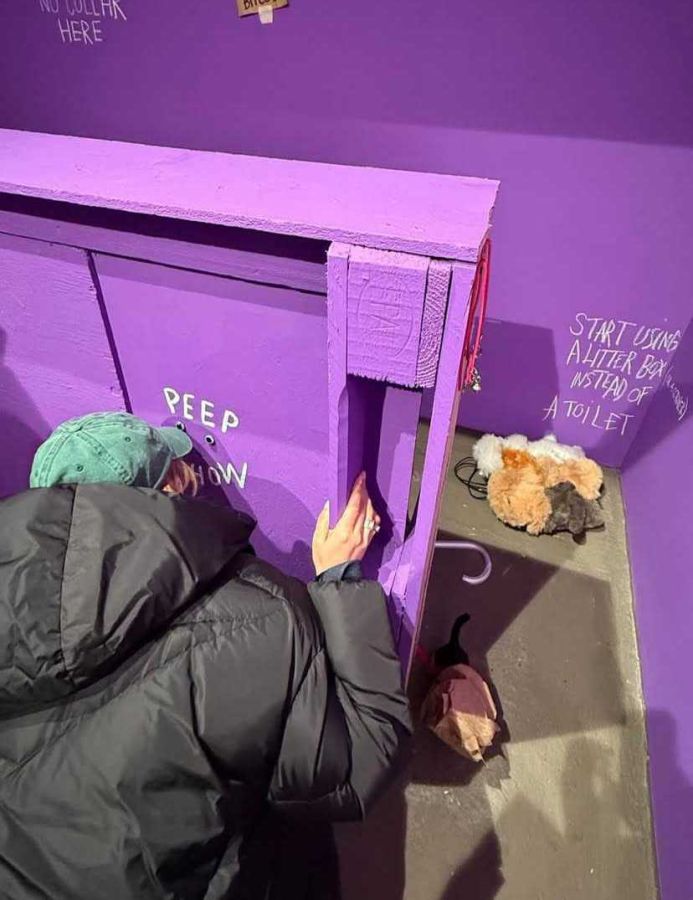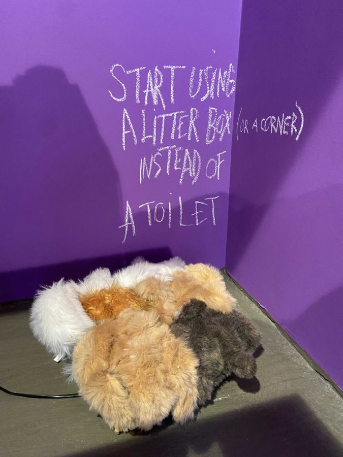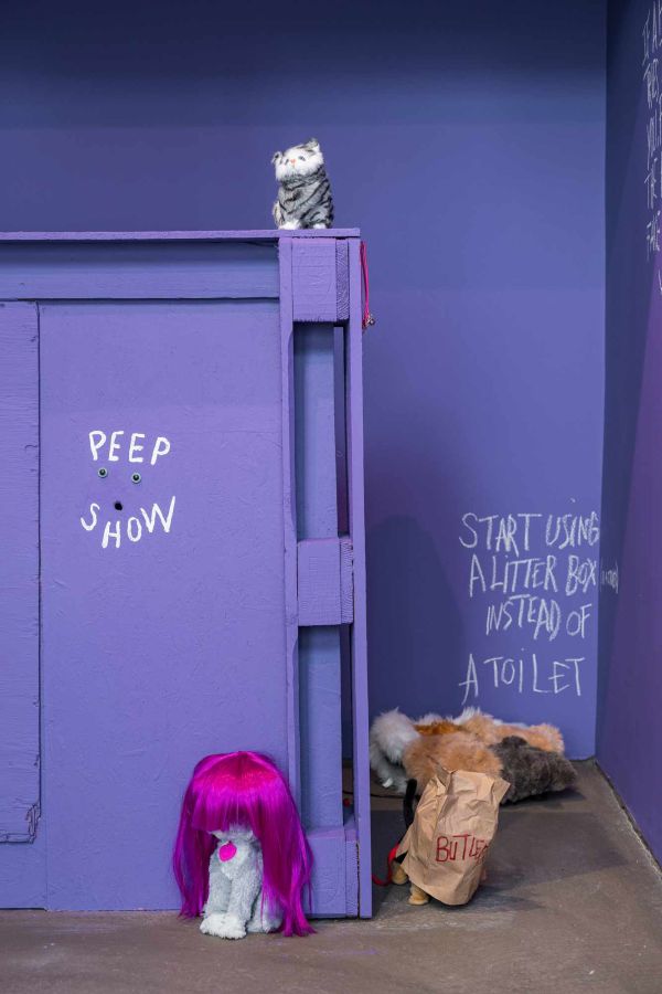 Des appareils de massage pour pieds recouverts de fourrure, activés en continu, viennent caresser et frotter les corps, matérialisant notre attirance paradoxale pour ces créatures capricieuses. Le dispositif, à la fois sensuel et légèrement glauque, joue de cette tension entre plaisir et servitude. Dans le comptooir, un petit trou porte l’inscription “Peep Show”. Le visiteur est invité à s’y pencher : à l’intérieur, des humains en pleine métamorphose glissent lentement vers l’animalité — des chats à têtes humaines, entre fascination et malaise.