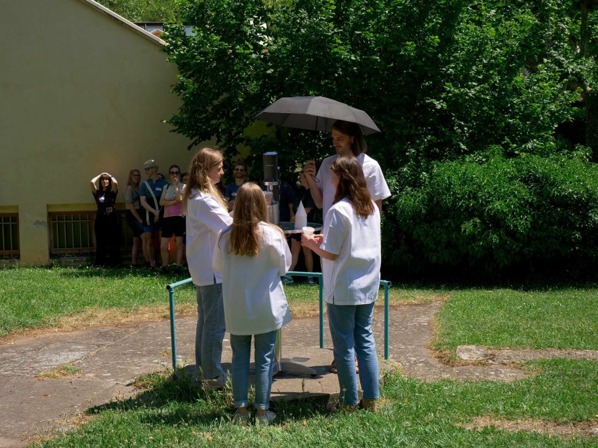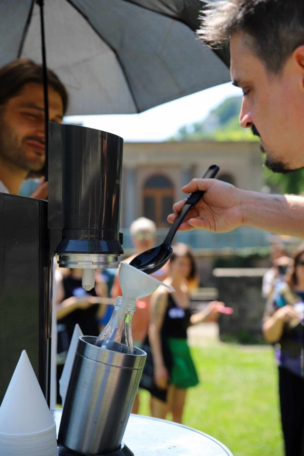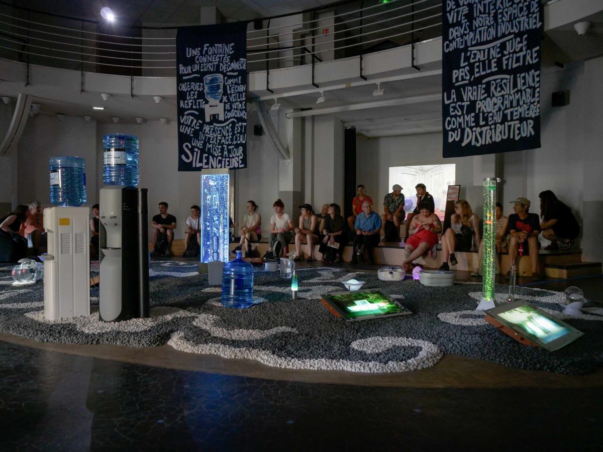 Les contributions s’additionnent, alimentant une machine à eau gazeuse. Récompense et bien-être garantis dans cette performance où l’eau devient une monnaie d’échange au profit de la satisfaction personnelle et de la cohésion d’équipe. Le rituel s’achève par la distribution d’une unique gorgée d’eau pétillante tiède – geste absurde et partagé, récompense minimale d’un effort collectif.