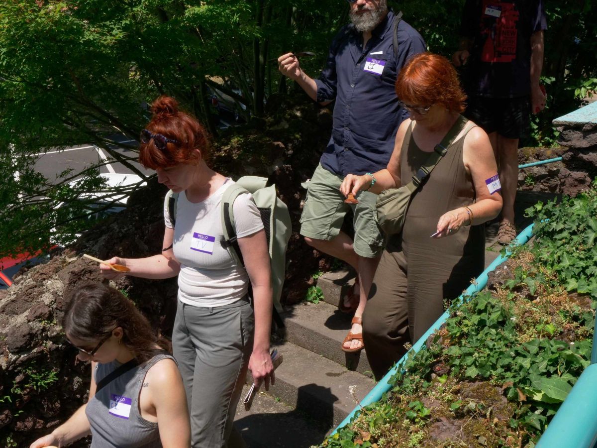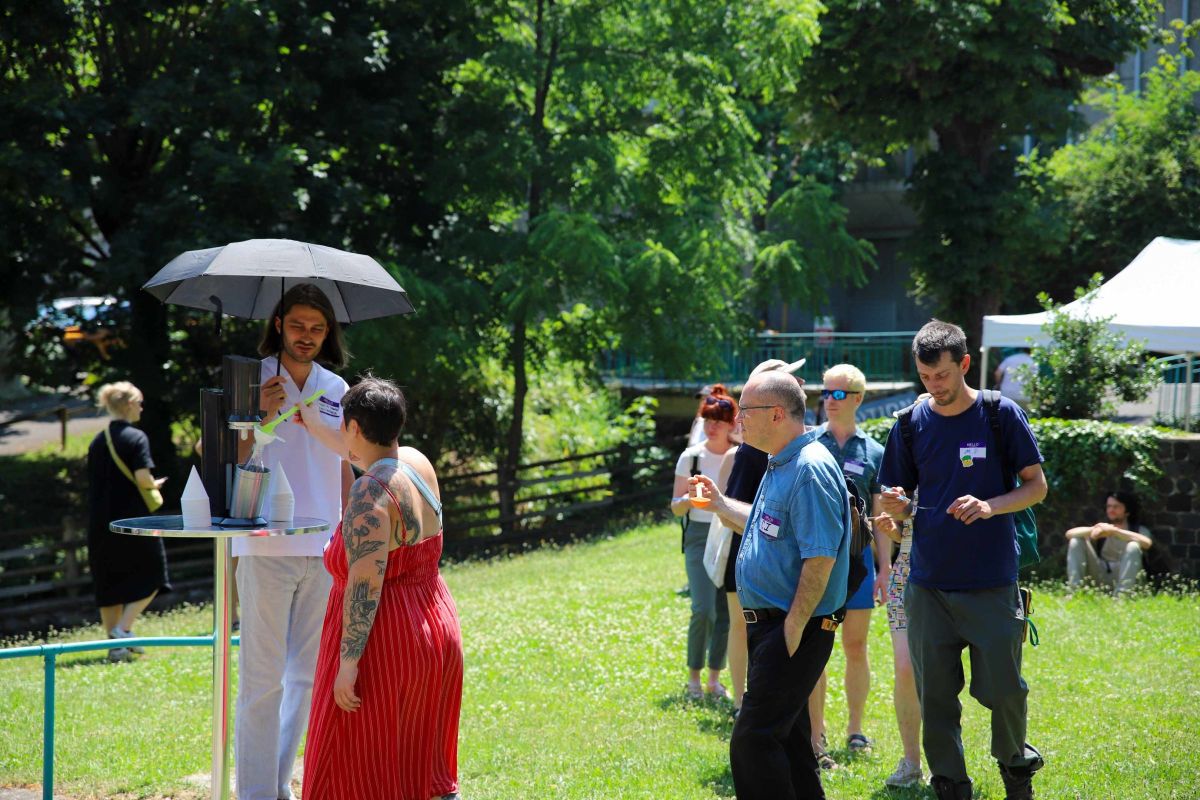Une procession lente s’engage, en silence : chaque participant·e transporte sa goutte vers la réserve collective, à l’extérieur, afin d’acheminer l’eau du jardin Z.E.N. artificiel vers son environnement naturel.