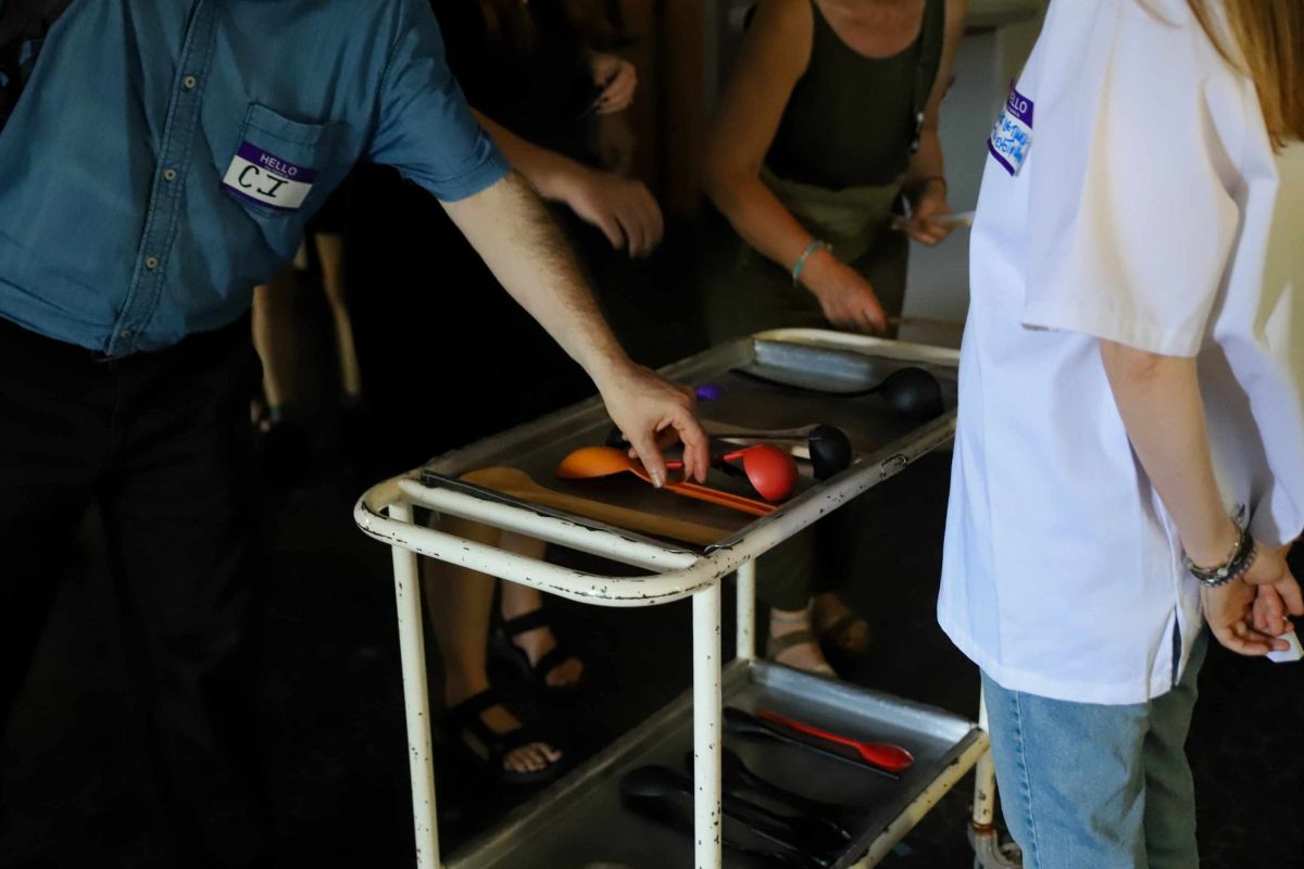 Dans un silence ponctué de chuchotements, les participant·es circulent lentement dans l’installation. Une procession rituelle s’engage : chaque participant·e est invitée à choisir une cuillère : prolongement symbolique de votre présence attentive. Avec elle, vous prélevez une goutte d’eau depuis un objet de l’installation.