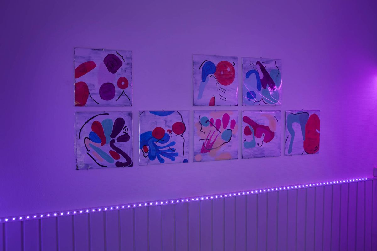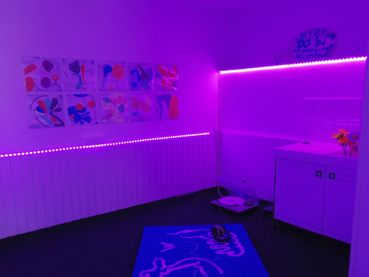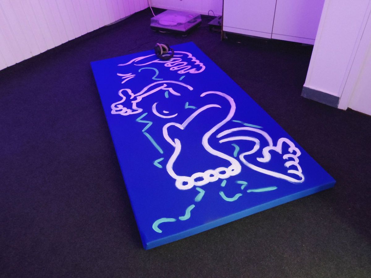 Des formes abstraites recouvrent les pochettes d’un disque que l’on est invité à écouter sur un tatami peint de motifs corporels mouvementés.