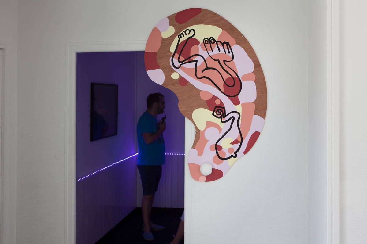Au seuil, un panneau en forme d’oreille nous y met la puce.