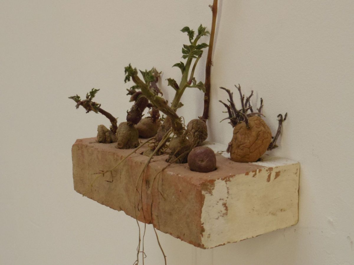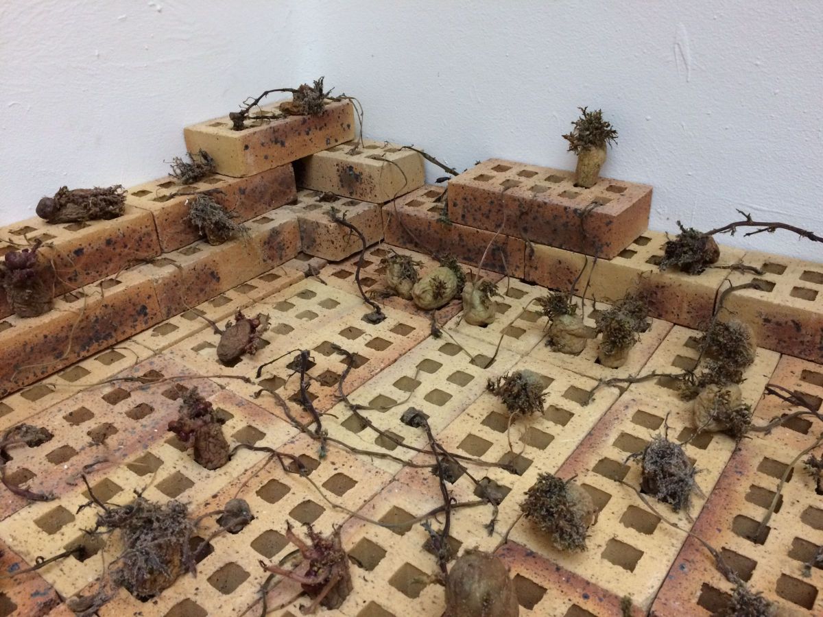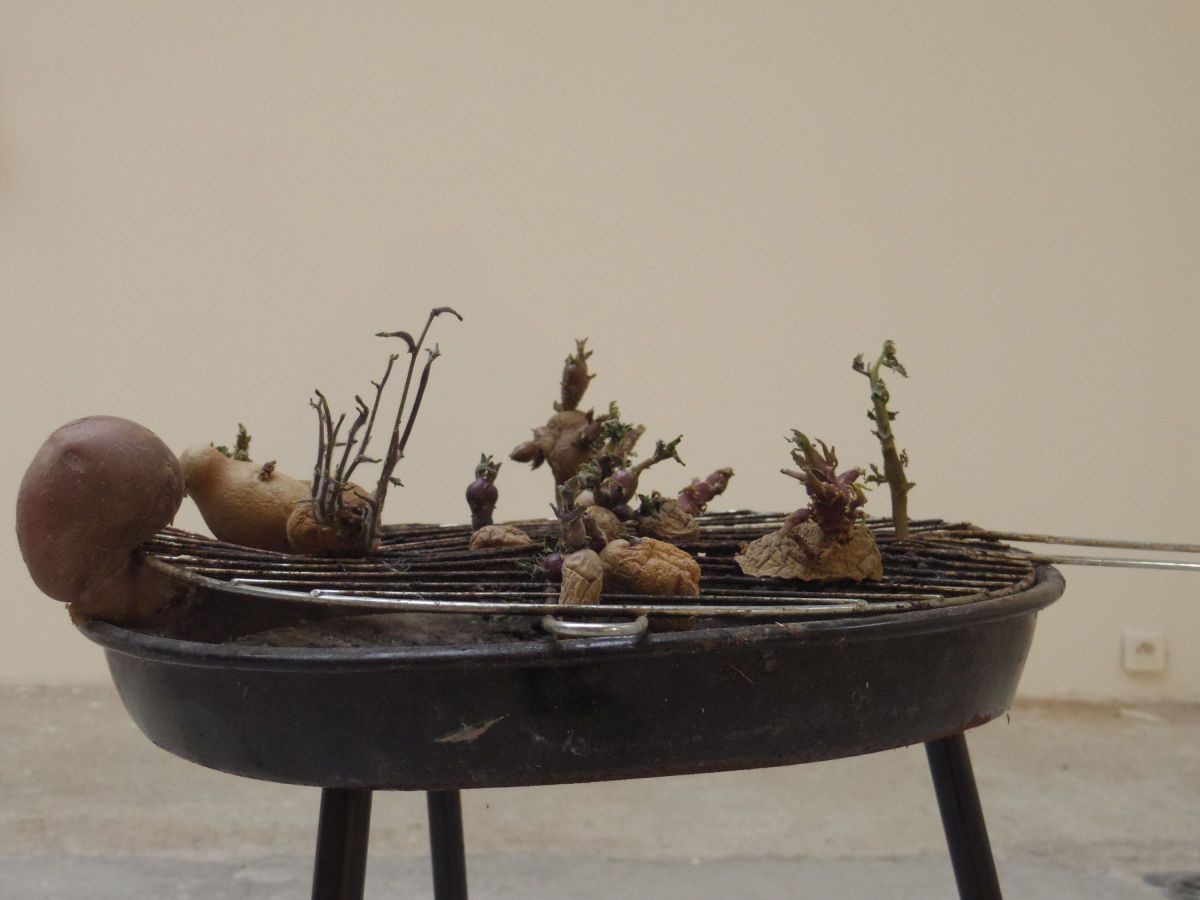 2016, installationPatates germées, briques, cuivre, pierres, seau, barbecue, 2016