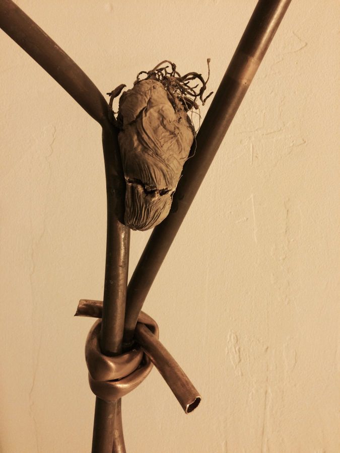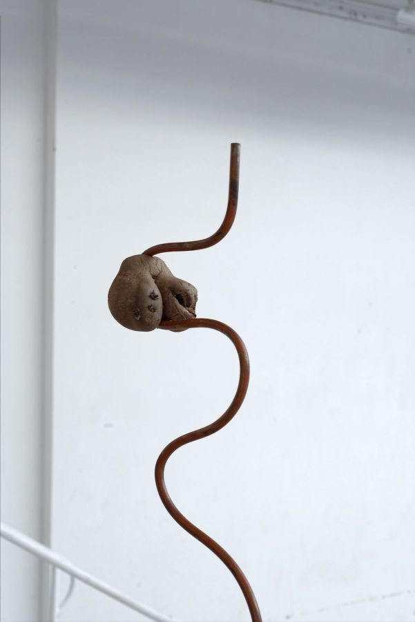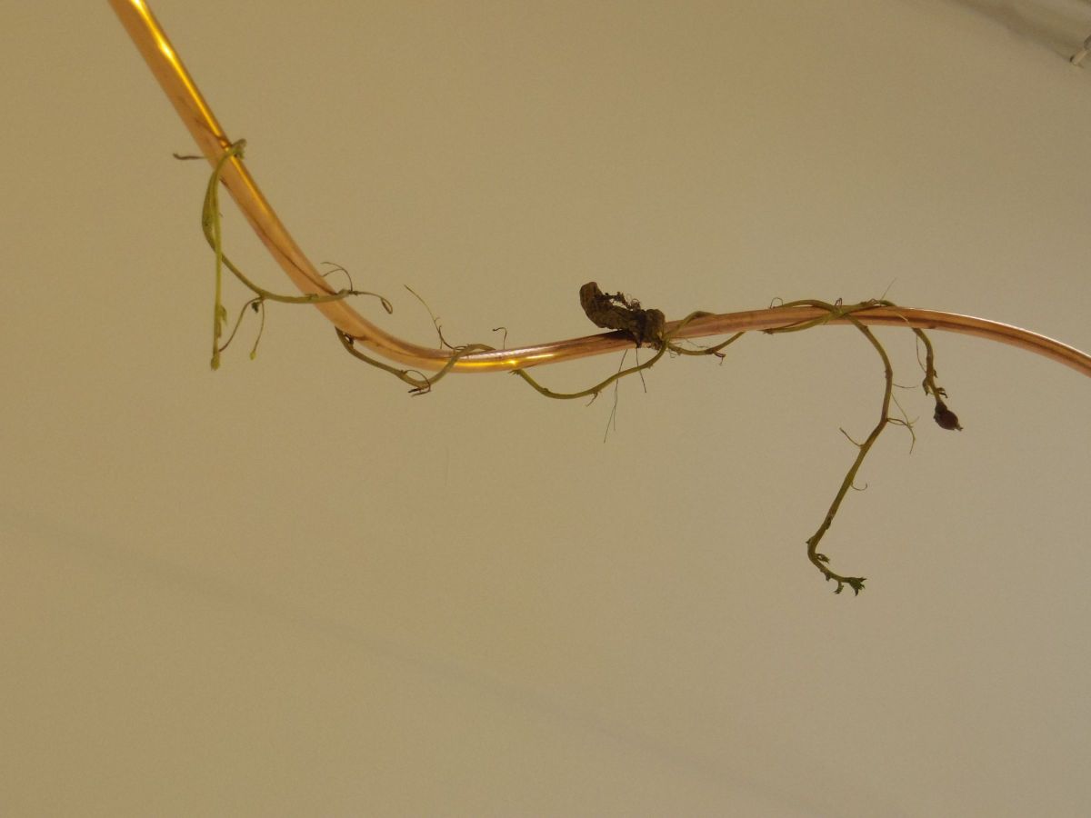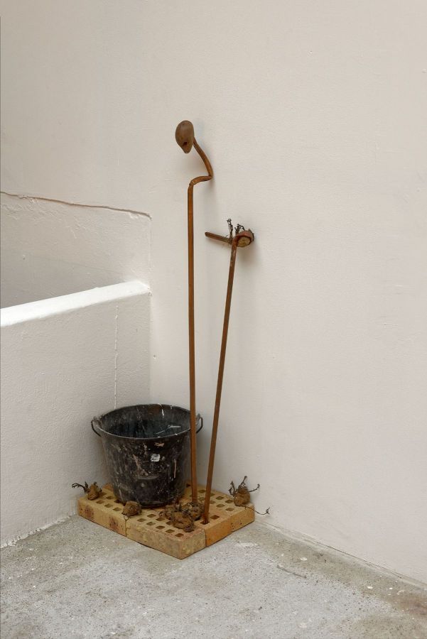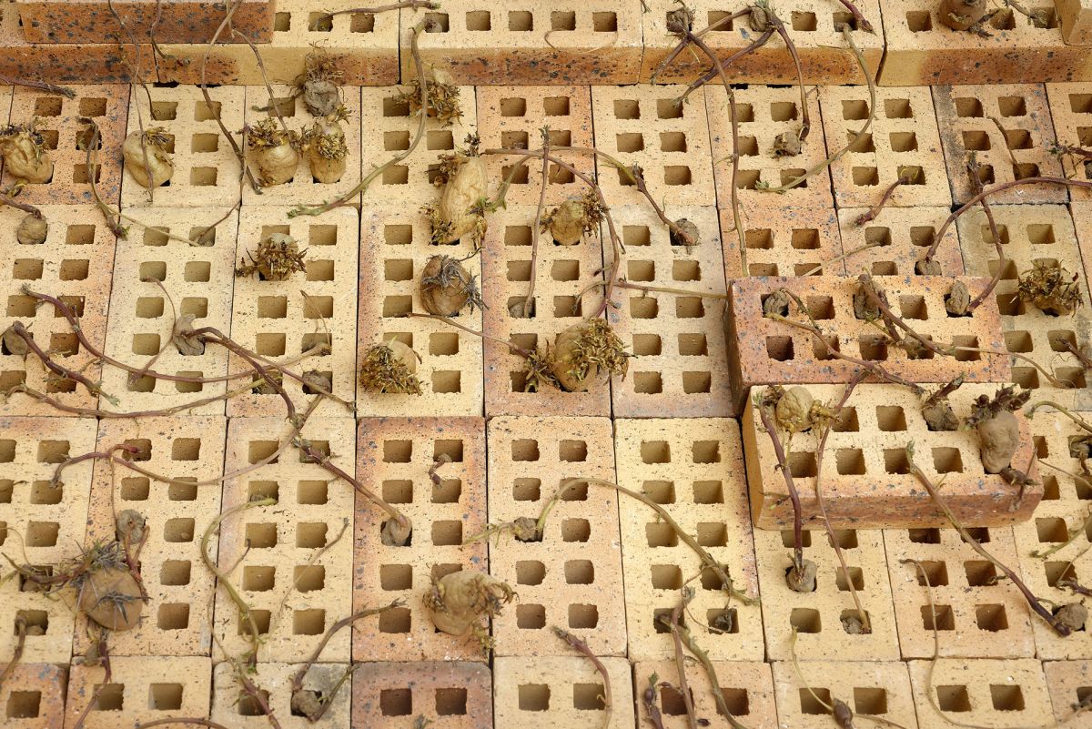 2016, installationPatates germées, briques, cuivre, pierres, seau, barbecue, 2016