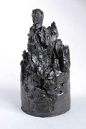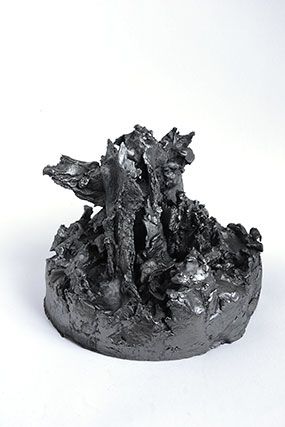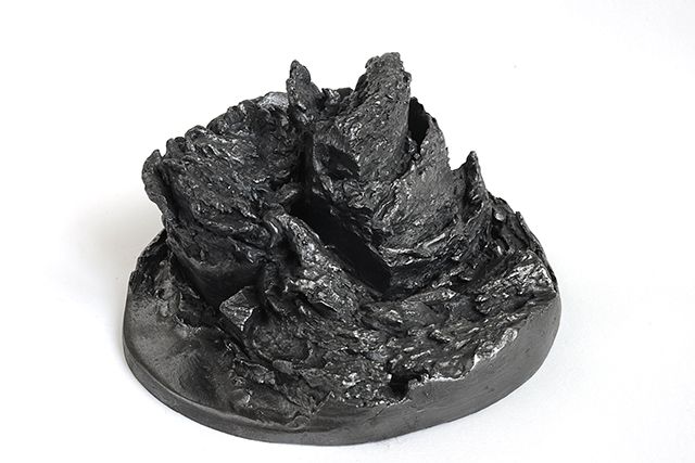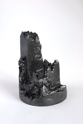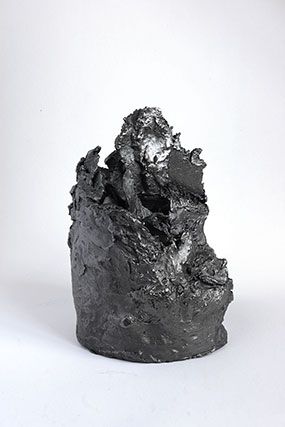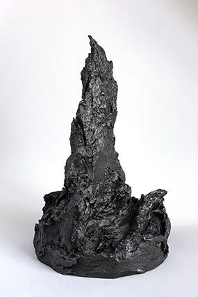 Plus que des paysages, c’est un monde que nous présente l’artiste, un monde d’avant la vie, minéral et sculptural. Et cet aspect est renforcé par les propriétés plastiques de la mine de plomb, qu’Angélique Lecaille utilise dans ses dessins mais également dans ses sculptures. Le graphite qui vient recouvrir les sculptures en terre Cairn et The far landscape of my mind leur confère ainsi une densité et une brillance toute métallique.