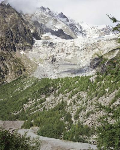 Vue du Gîte à Balmat : le Gros Béchar, glacier de Taconnaz Au premier plan à gauche: glacier des Bossons