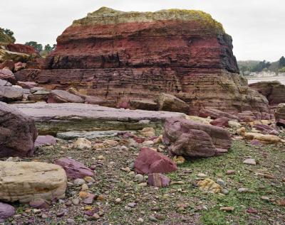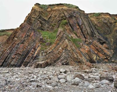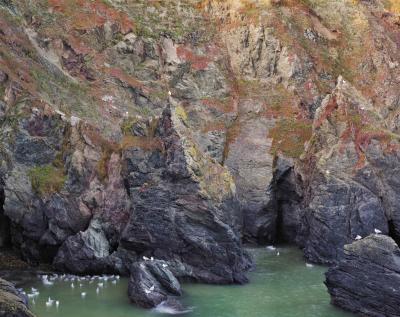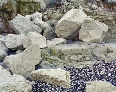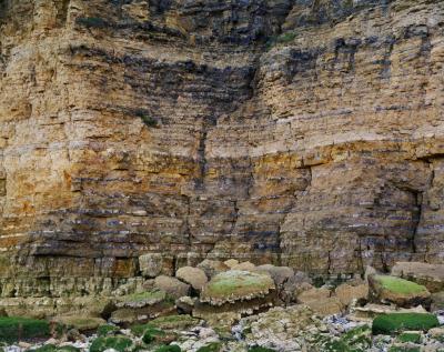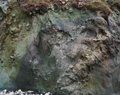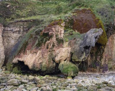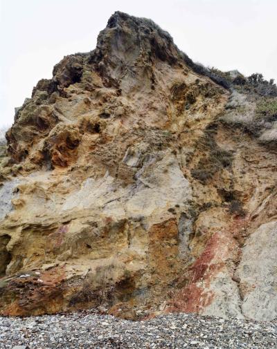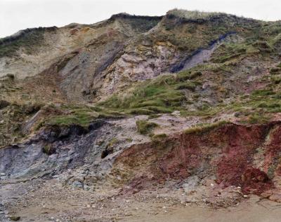 La côte semble ainsi une gigantesque palette sur laquelle la mer a essayé ses couleurs : les mauves se marient aux jaunes et aux verts de chlorophylle et de boue mêlées, les ocres lépreux bourgeonnent de buissons nains, les gris entaillés de dépressions bleuâtres semblent s’incliner sous la poussée des vents, les grès sombres veinés de rose se découpent sur le ciel gris, les falaises dressent le profil crénelé de leurs murailles blanches décapées par le sel, leurs tourelles coiffées de gazon ras, parfois maculées de lichen sombre, ou striées de bandes verticales dessinées par les eaux de ruissellement.