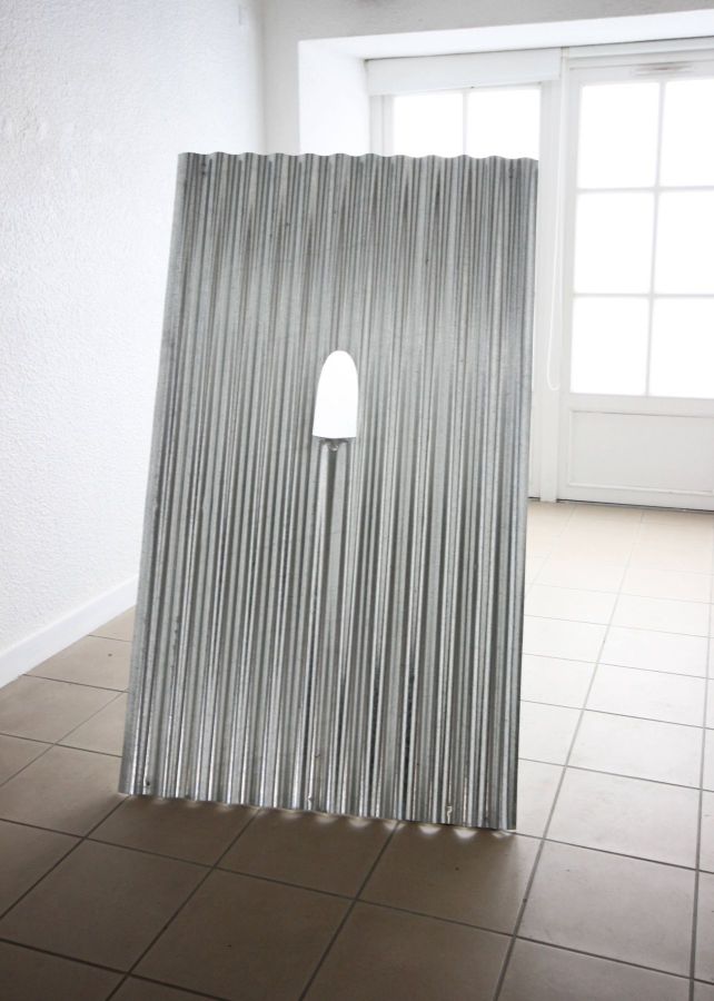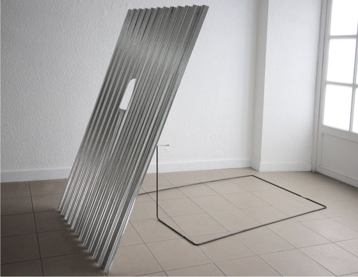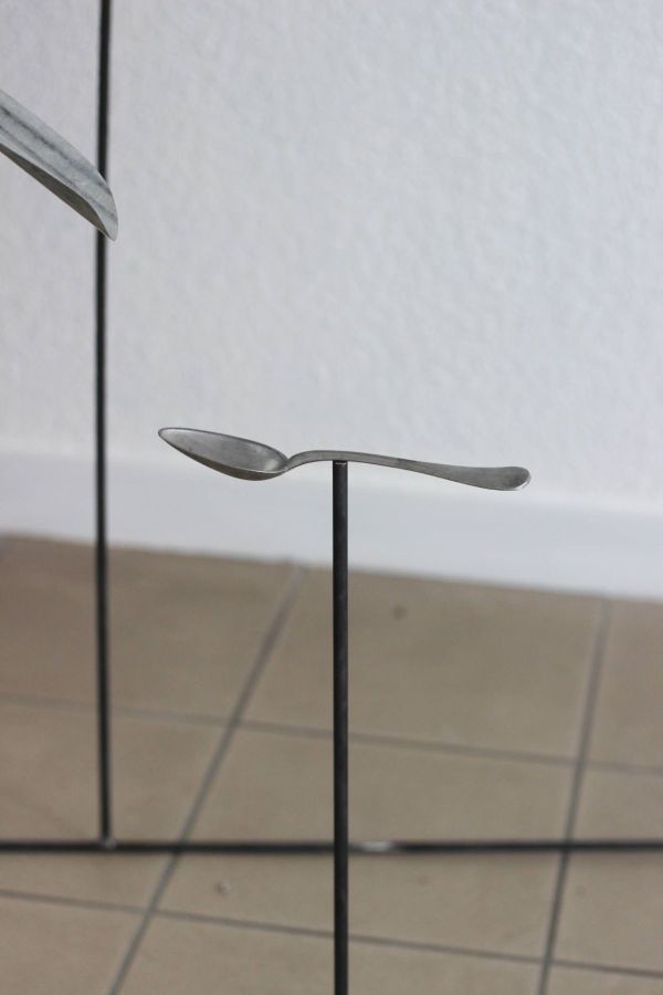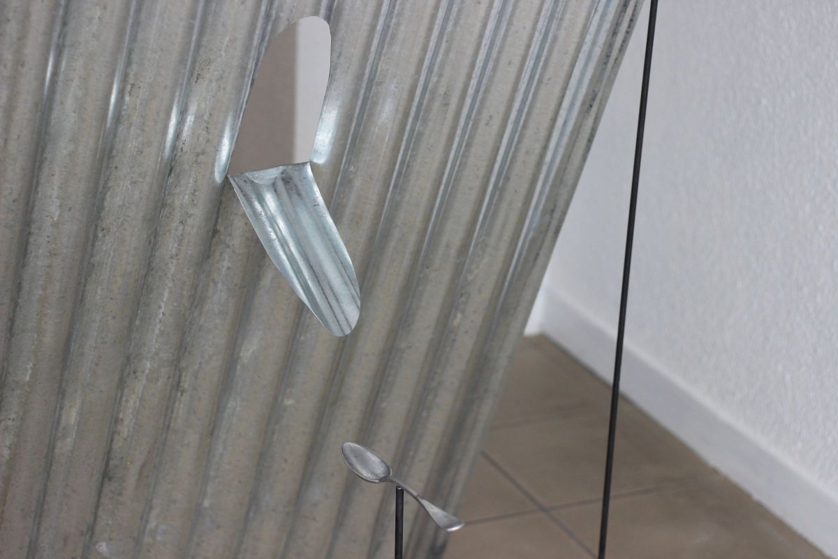 Tôle ondulée, acier rond et grande cuillère en inox, 155 x 90 x 200 cm.