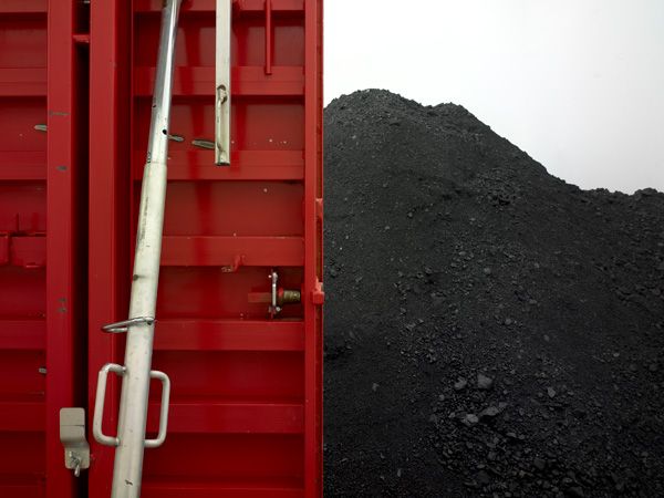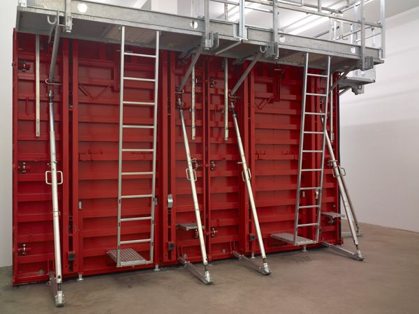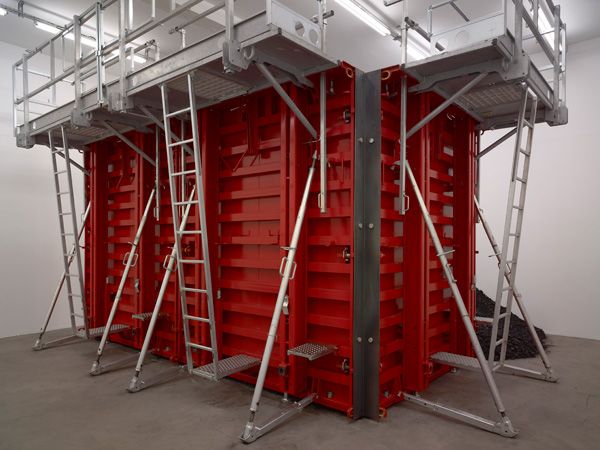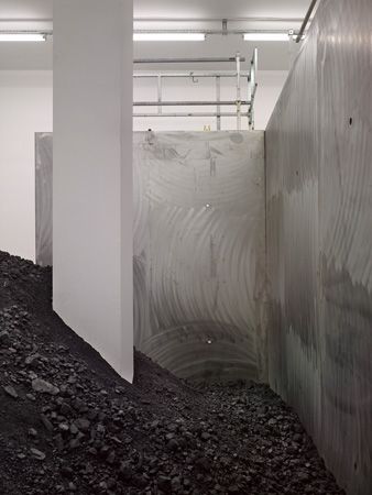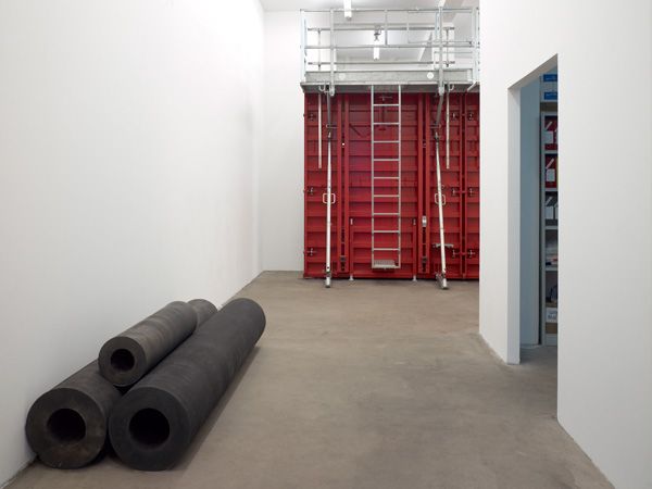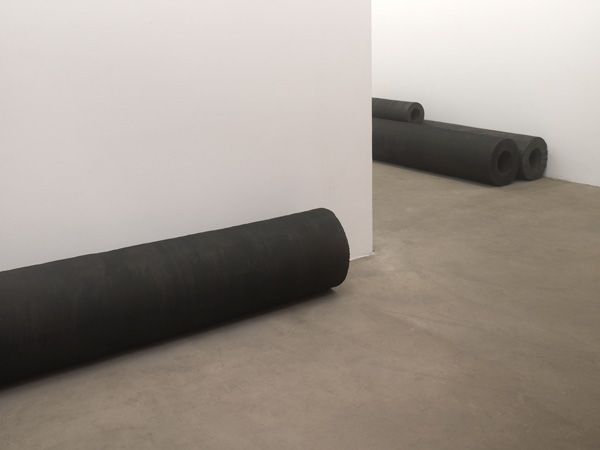 Issu d’un répertoire de matériaux et de formes élémentaires disponibles en nombre sur les docks, ce dispositif se présente comme un échantillonnage démesuré d’une série d’éléments emblématiques de l’industrie portuaire. Quatre défenses d’accostages, imposants cylindres de caoutchouc, sont disposées au sol et plaquées contre les cimaises. Trois banches métalliques utilisées pour le coffrage de murs en béton partitionnent l’espace et contiennent un volumineux tas de charbon provenant de la centrale thermique du port.