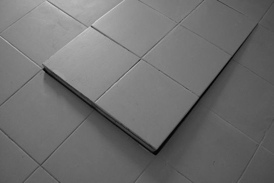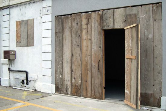 Dernière phase d’une série d’actions initiées lors d’une résidence au cœur de la friche industrielle dans laquelle est implanté l’espace Kugler, cette installation implique deux gestes élémentaires et contradictoires. Afin d’affirmer le contraste qu’opère implicitement la galerie avec son environnement urbain, la façade est barricadée à l’aide de planches récupérées sur le site. A l’intérieur, une ouverture est percée dans le sol de manière à suggérer un passage vers un complexe architectural beaucoup plus vaste. Chacune de ces interventions souligne l’idée d’un espace intermédiaire, espace accessible et/ou fermé, potentiellement source d’histoires et de récits.