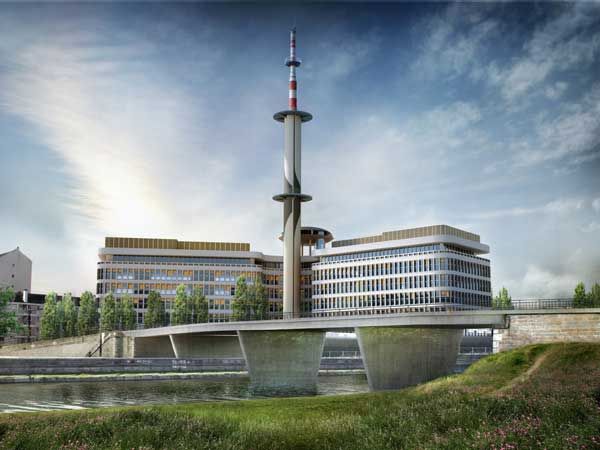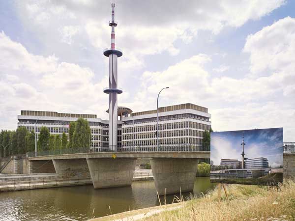 Un panneau standardisé de type promotion immobilière est installé devant le Centre des Télécommunications de Rennes construit entre 1976 et 1979 et demeurant inoccupé depuis 2008. Le bâtiment dessiné par Louis Arretche, architecte et urbaniste conseil de la ville, répond aux visions prospectives d’une ville nouvelle défendues après-guerre par Henri Fréville et qui reposaient sur l’extension moderniste des infrastructures urbaines.