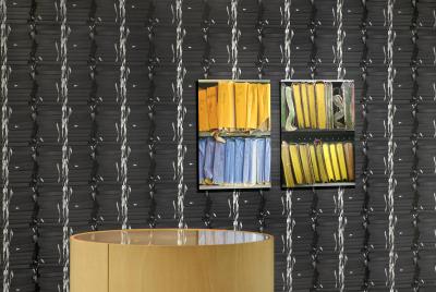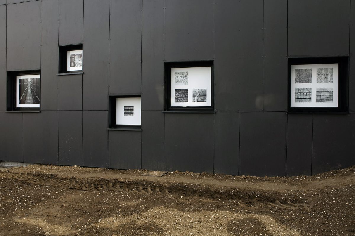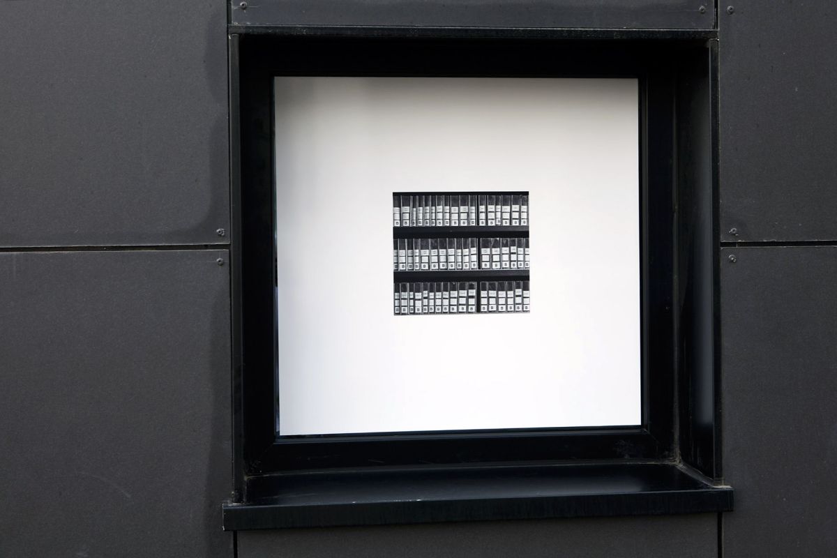 L’installation présentée dans l’exposition met en dialogue des vues photographiques prises dans les espaces de stockage des Archives départementales du Nord avec une sculpture-bibliothèque (contenant des index manuscrits) disposée sur un tapis imprimé de minutes notariales et divers objets en papier provenant du pilon ou du recyclage.