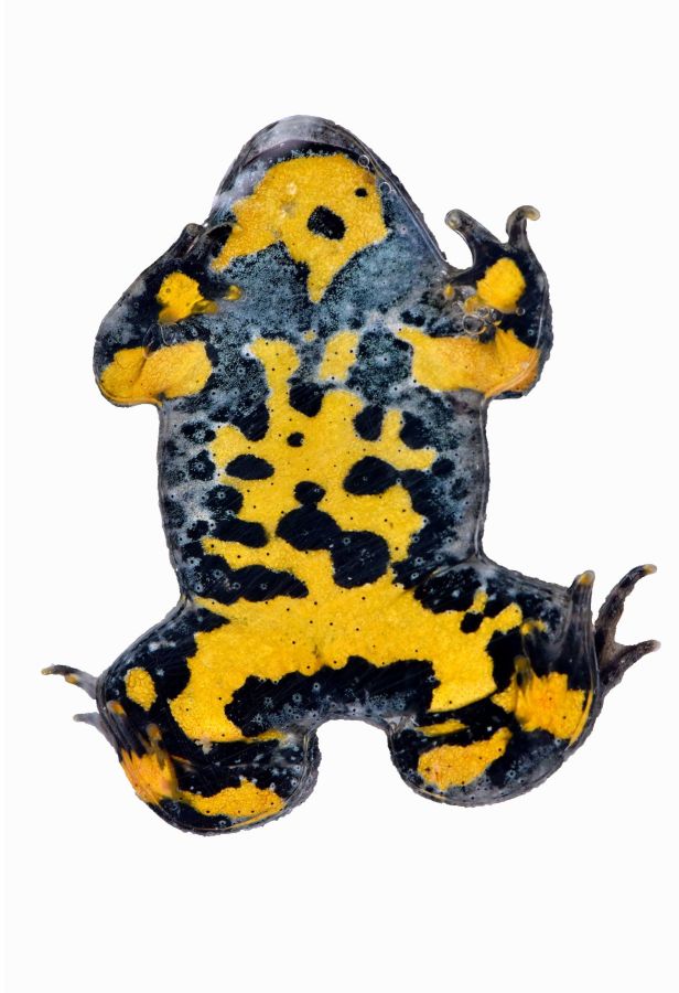 Bombina V. Crapaud sonneur à ventre jaune, espèce protégée de la forêt de Verdun, bois de Beaumont en verdunois (faces ventrales inversées) Tirage jet d’encre pigmentaire sur vinyl marouflé sur dibond, pelliculage mat mat, 35 x 86 cm. Tirage limité 3 exemplaires