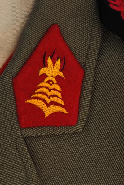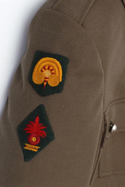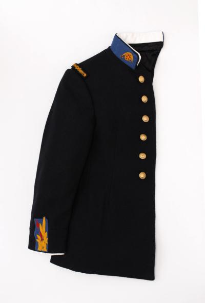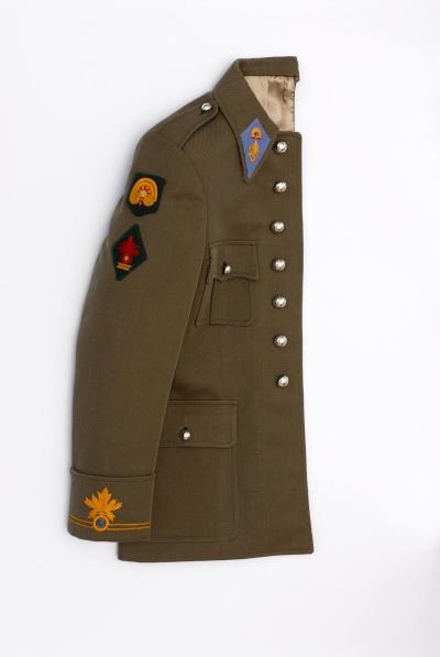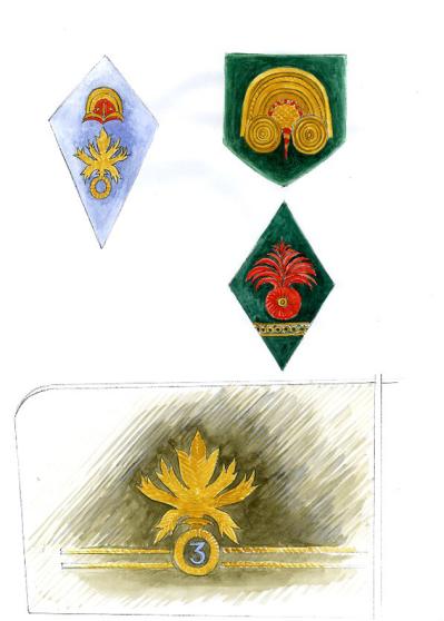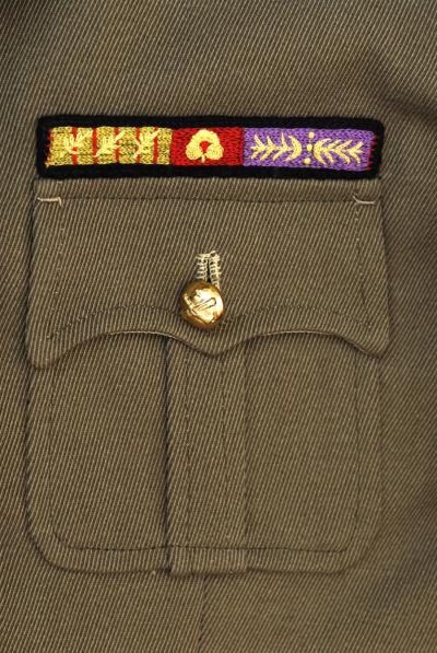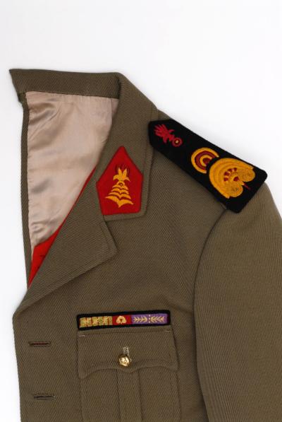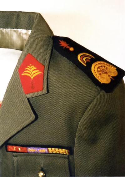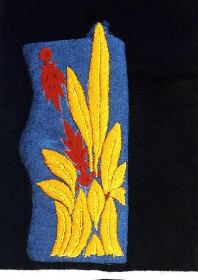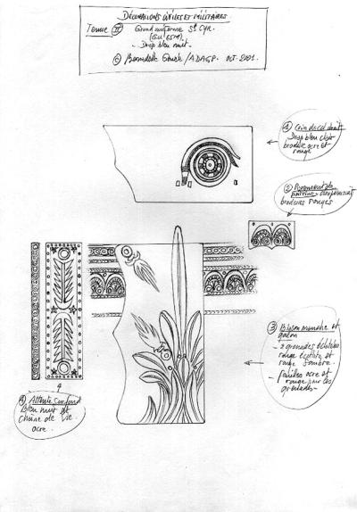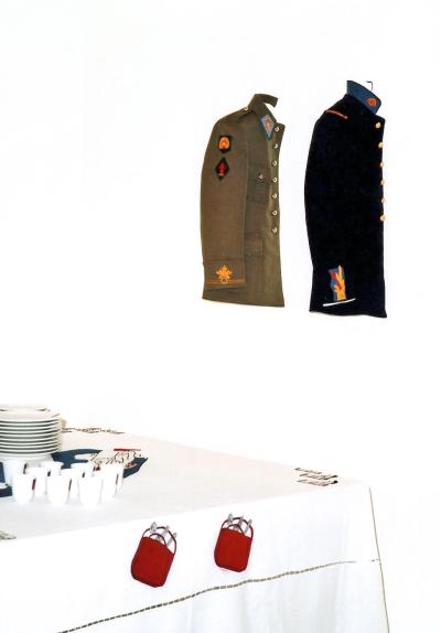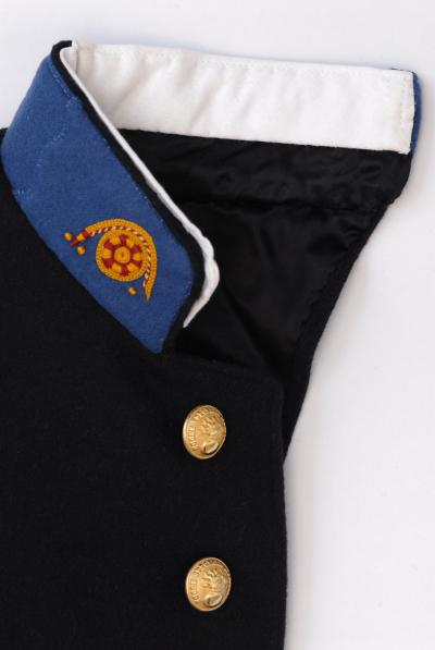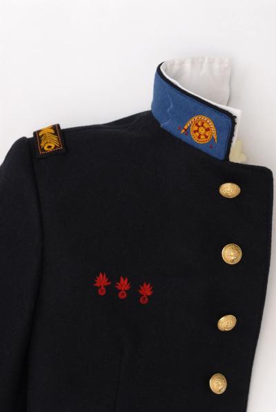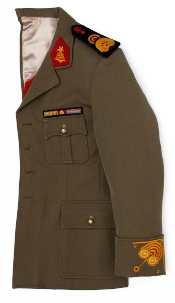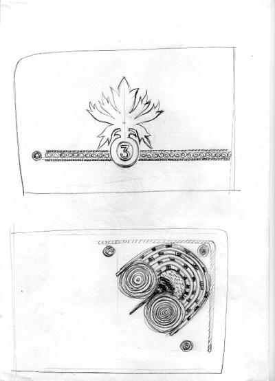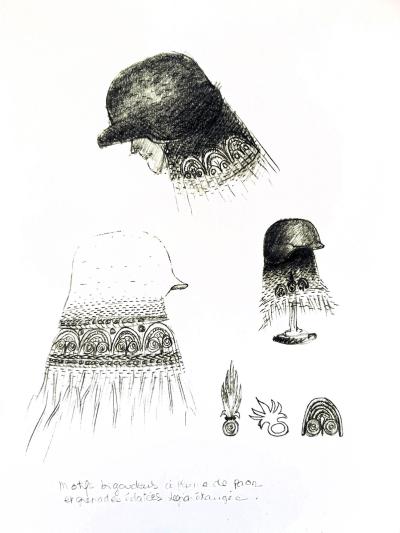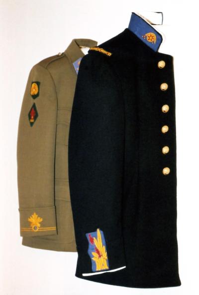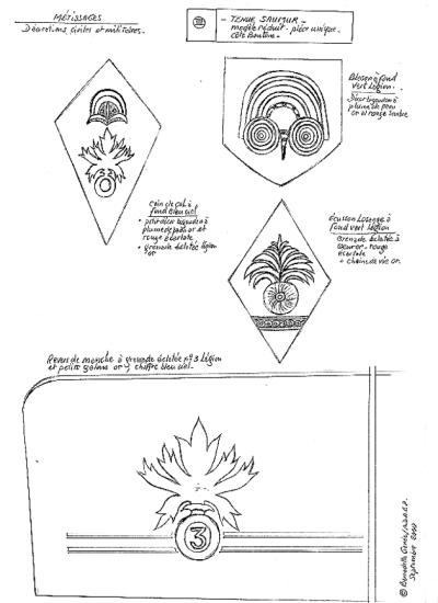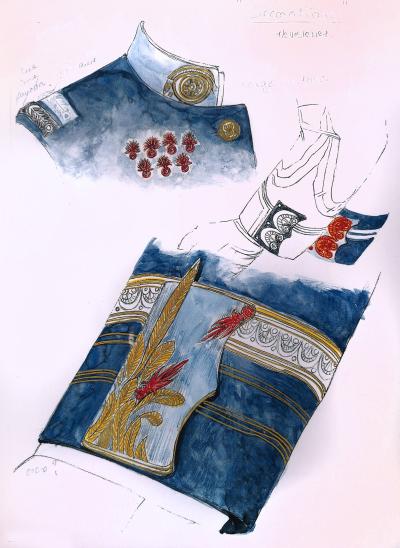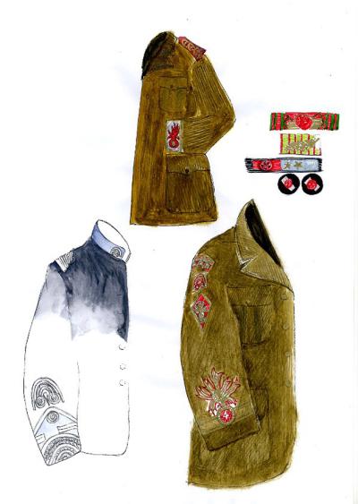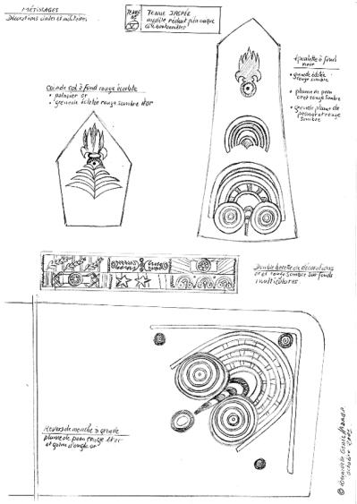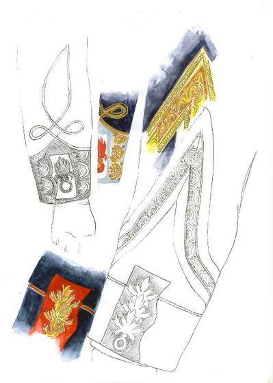Décorations civiles et militaires, modèles réduits de cinq demies vestes militaires réalisées dans le cadre du projet Métissage (Délégation aux arts plastiques, ministère de la culture) par des maîtres tailleurs civils et militaires, brodées par Pascal Jaouen, détails (dessins et aquarelles préparatoires des artistes)