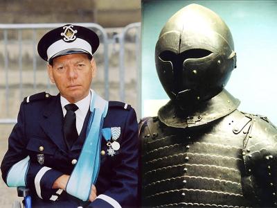 Le Colonel de Fontenay, chef de cabinet du Général Hervé Gobillard, Gouverneur des Invalides, devant un tirage sur bâche de la garde d’honneur des Invalides