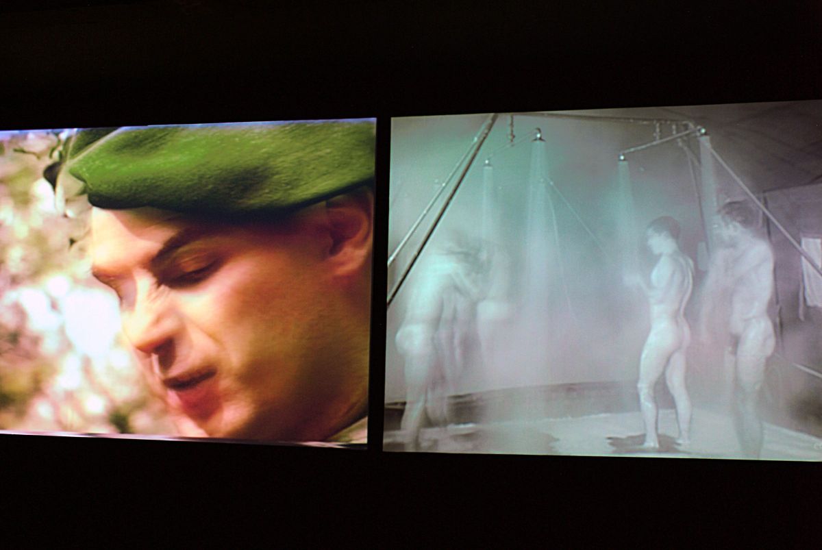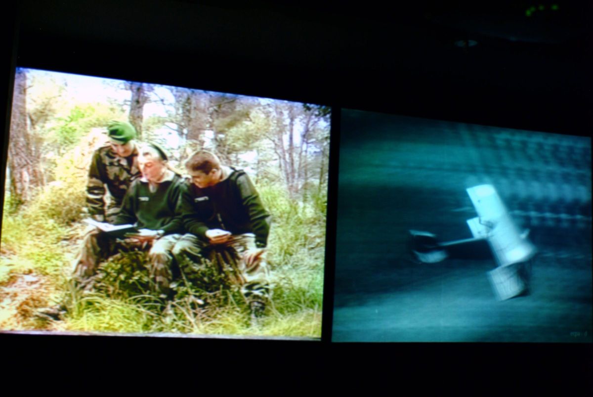 Le troisième espace présente un corpus de films militaires et de vidéos réalisées par les artistes. Aubade, Sortilèges et Je crèche derrière le musée, tournées avec la participation de la Légion Etrangère, évoquent chansons, poèmes et crèches de Noël. Simultanément, la programmation de films extraits des archives de l’ECPAD (Etablissement de Communication et de Production Audiovisuelle de la Défense), sélectionnés par les artistes, présente des militaires pratiquant des activités parallèles, par nature étrangères au combat. Apparaissent, en marge des guerres, des occupations qui relèvent de la culture et de la vie des hommes, en rupture avec ce que l’on imagine être leurs missions habituelles.