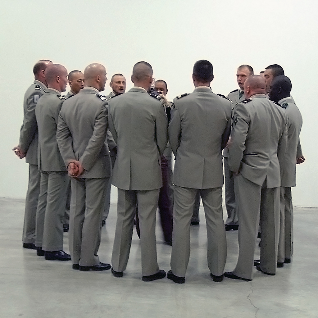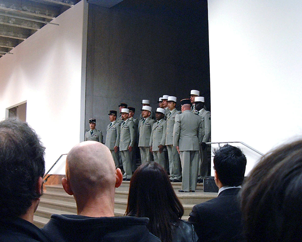 Inauguration de l’exposition, après des répétitions dans les bureaux du Palais de Tokyo, performance d’un groupe de chant légionnaire dans les espaces du Palais