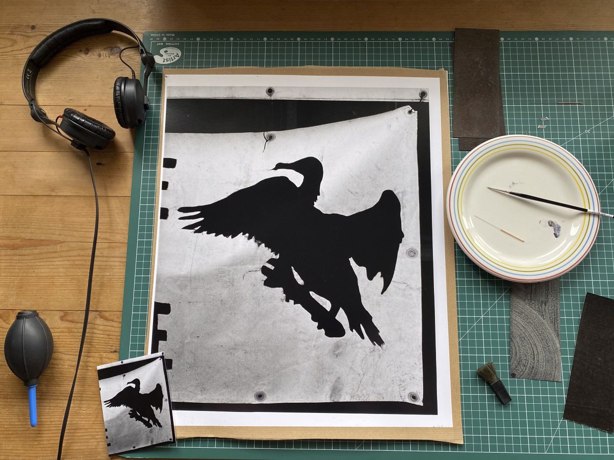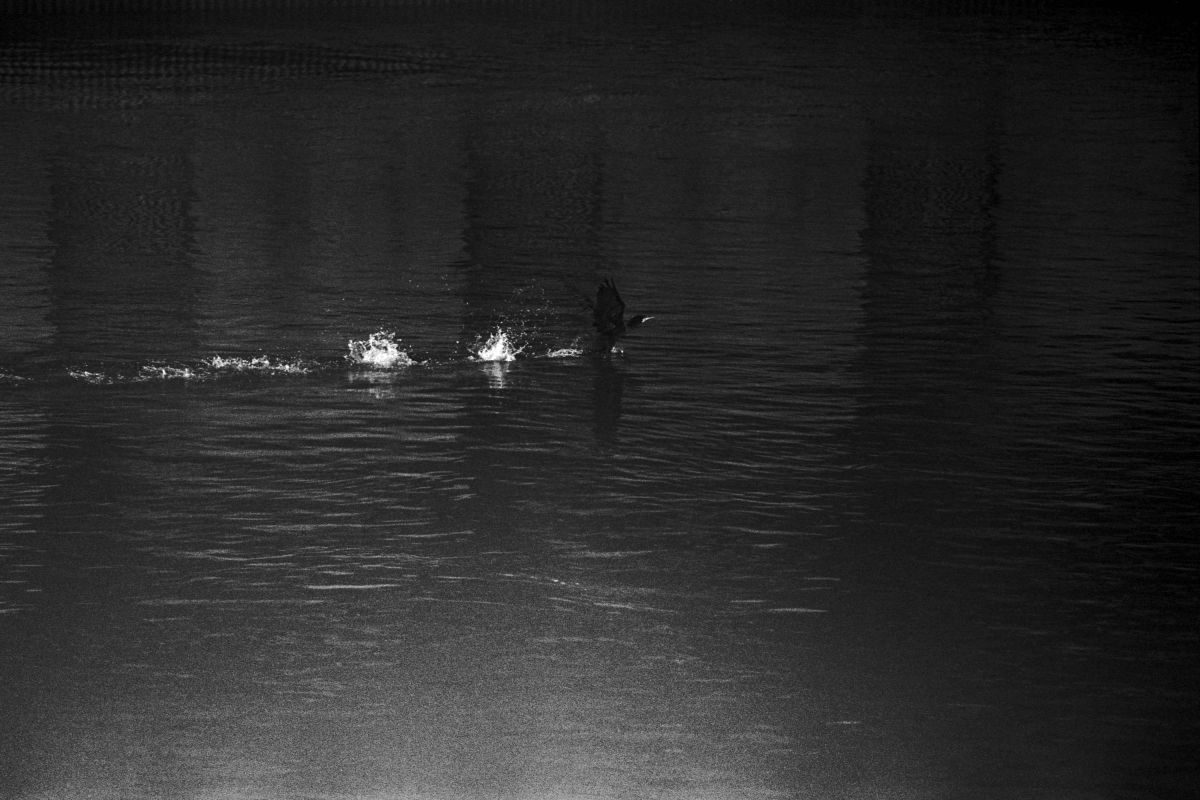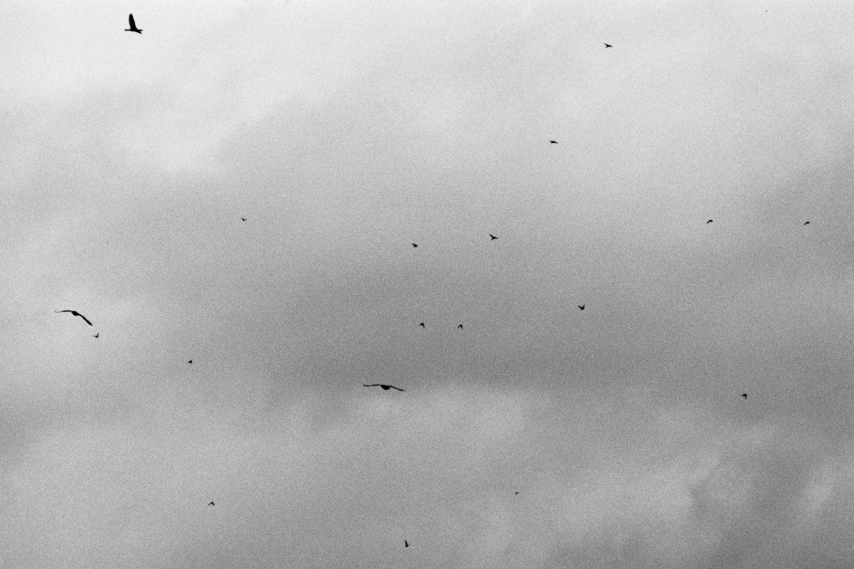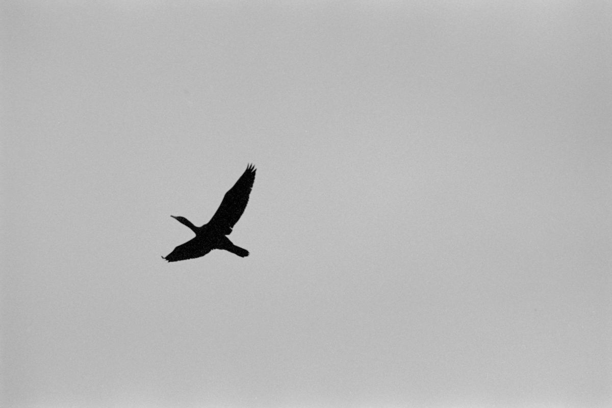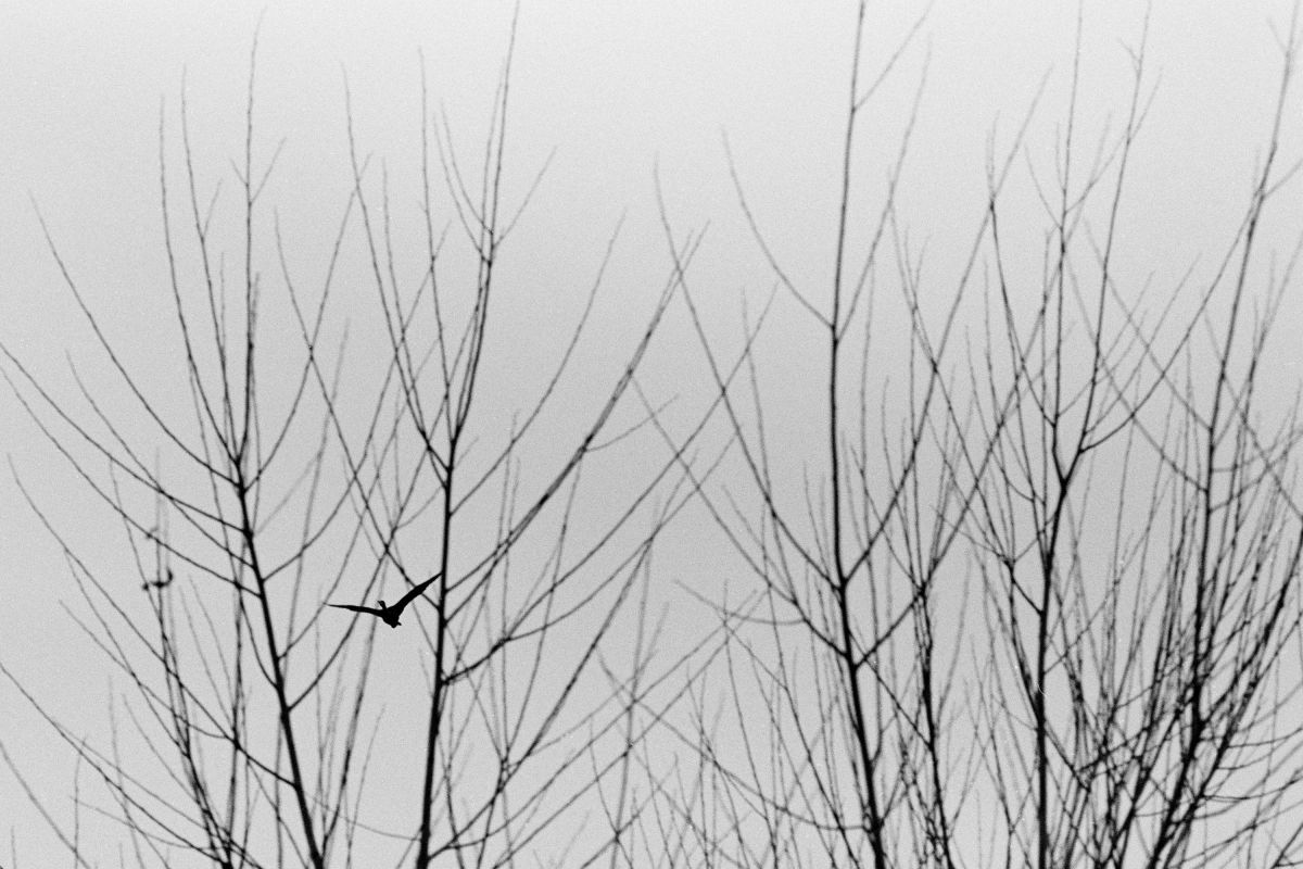 Je photographie en argentique, en noir et blanc. Le film à l’inverse de l’image numérique, nécessite une certaine économie d’image. C’est une pratique méditative, plusieurs heures d’observations sont parfois nécessaires pour photographier un envol, un travail de patience et de précision, déclenché au millième de seconde, à la vitesse d’un battement d’ailes. Le mouvement de l’oiseau est trop rapide pour conscientiser le moment de prendre l’image : c’est aussi une photographie à l’instinct, lorsque je sens le mouvement venir, je déclenche. Je ne découvre qu’une fois le film développé ce que j’ai photographié.