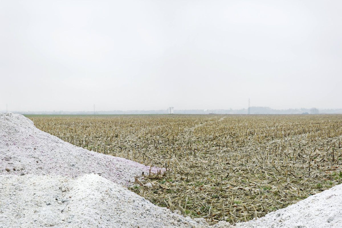 Pour comprendre ce qui était en jeu dans ces paysages, j’ai beaucoup lu : des livres d’histoire, de géographie, de sociologie sur l’agriculture, sur la transformation du monde paysan en monde agricole, et avec elle toutes les mutations d’un système économique, de la relation au temps et au sol. Ces paysages ruraux sont désormais pensés à l’échelle européenne, régis par la Politique Agricole Commune, voir mondiale. Pour les photographier, je faisais des repérages depuis des images satellites. Puis, à pied, je longeais des routes assez passantes, de grosses départementales ou des nationales. Depuis l’accotement étroit, entre la route et le fossé, je me faisais souvent klaxonner et j’expérimentais physiquement quelque chose de troublant : ce paysage, fabriqué par la machine, n’avait pas été pensé pour le piéton, il m’était hostile.