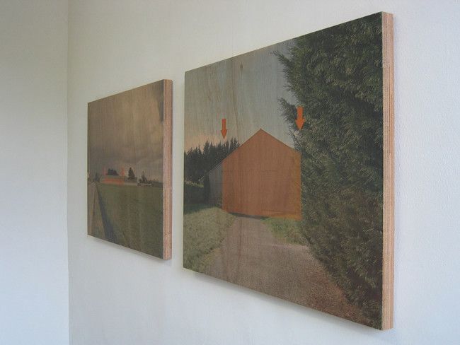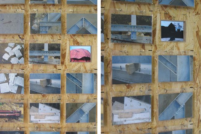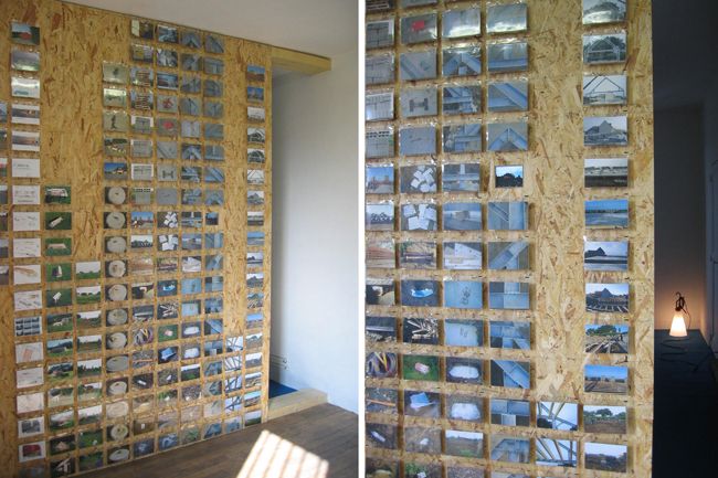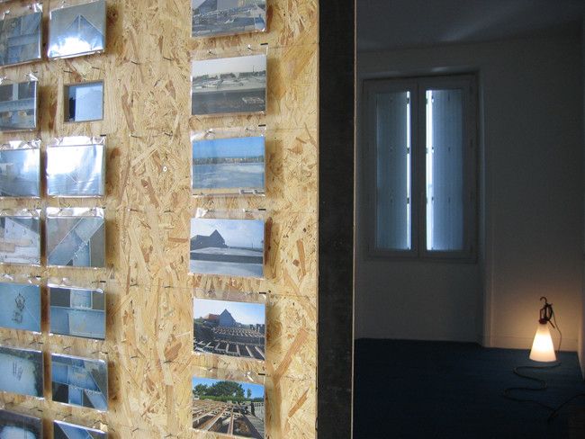 Installation multi-médias, en diptyque. Séries de 500 tirages photographiques du commerce 10 x 15 sous protections plastifiées, panneaux OSB, clous, diffusion sur un mini-lecteur dvd de la série vidéo ce sera beau quand ce sera fini..., parois construites avec les chutes de matériaux provenant du chantier de la maison en construction (bastaings douglas, panneaux OSB, plâtre et peinture blanche), lampe destinée à la chambre d'enfant de la future maison, moquette, vidéo surfaces utiles diffusée sur moniteur, 2 tirages numériques sur CTBX