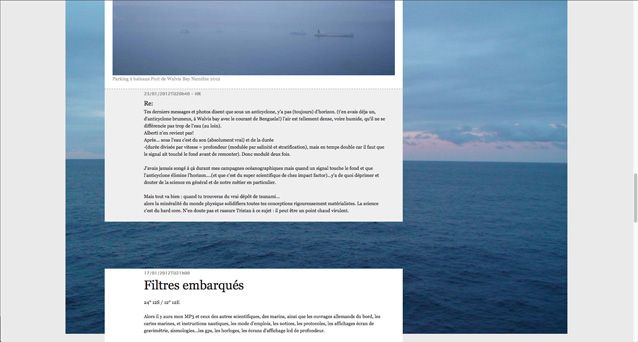 Sentiment Océanique est écrit au fur et à mesure du déplacement de la mission. Aucune modification ne sera effectuée par la suite. Il a été convenu que les textes et images étaient adressés” mais qu’aucune obligation de réponse n’était exigée des interlocuteurs.
