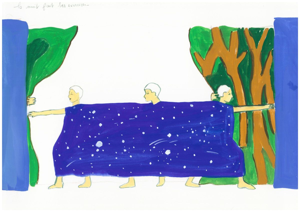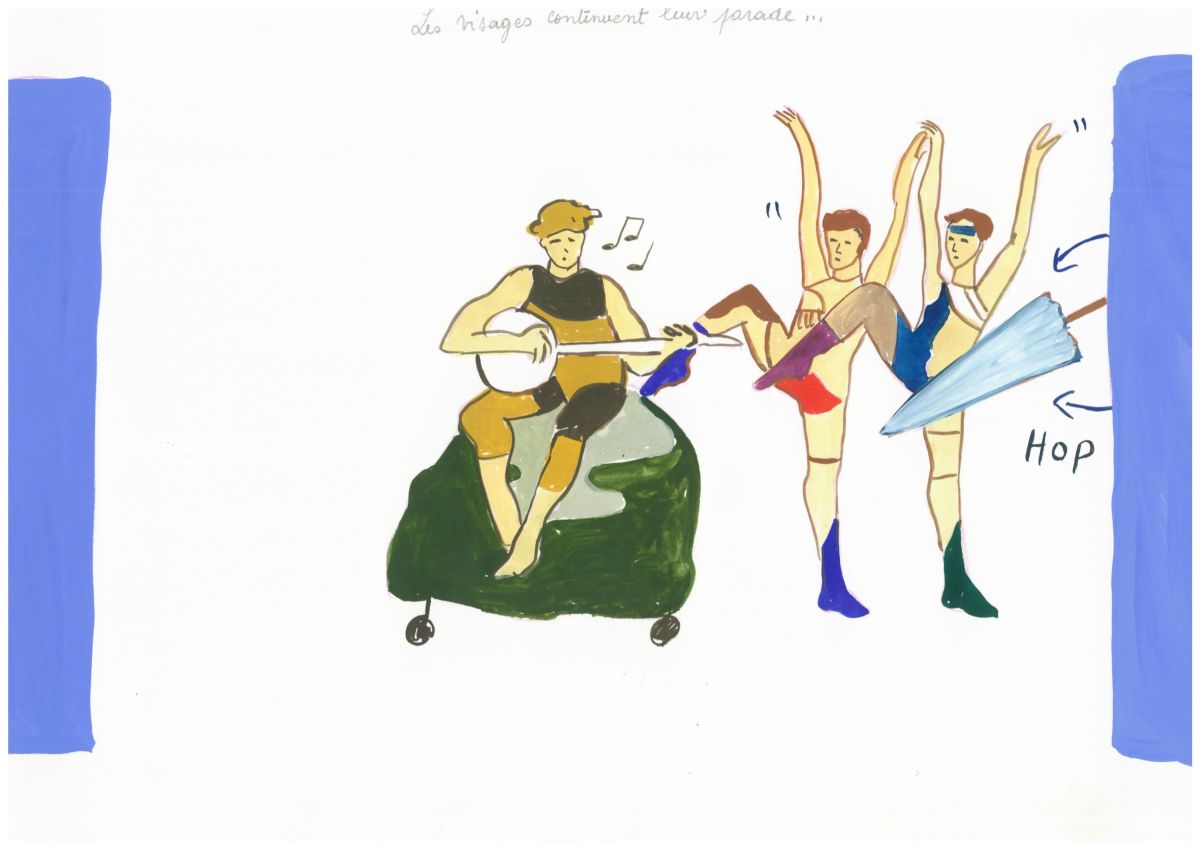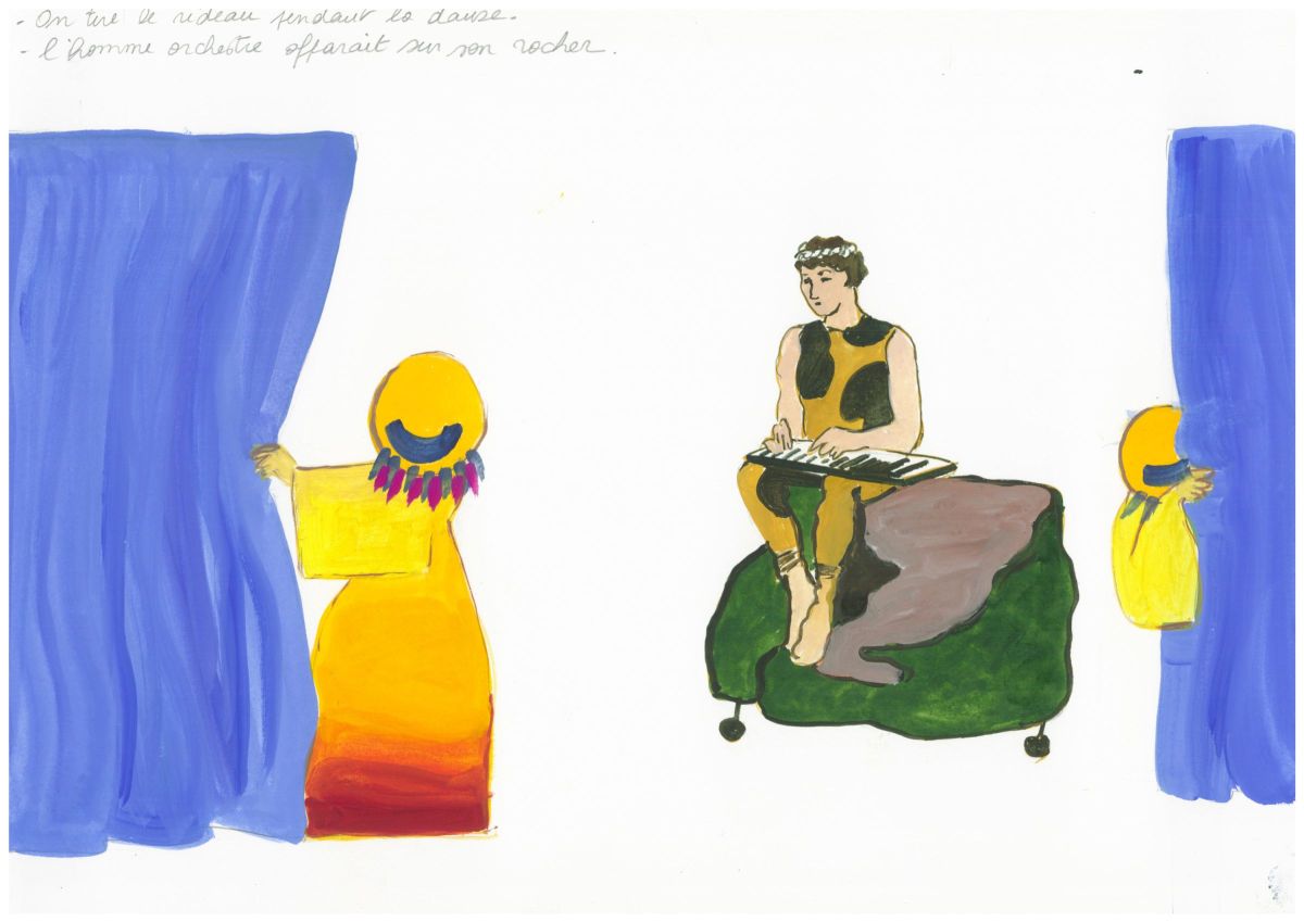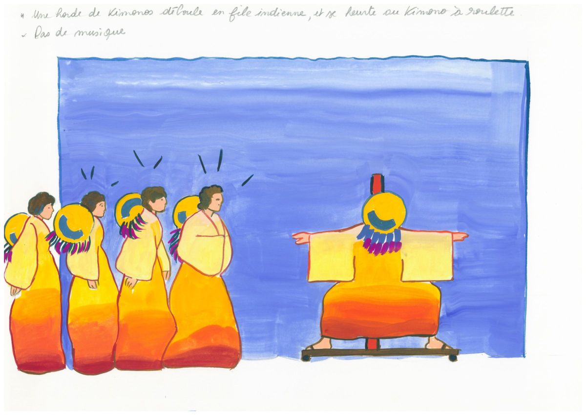 Enchaînement de tableaux vivants éclectiques, joués par des danseurs vêtus de costumes peints, manipulant des décors et des « objets rituels », l’idée de cette pièce est née au cours de mes expériences au Japon et en Australie, des cultures qui m’ont attiré pour leurs rituels performatifs vernaculaires, à la croisée du théâtre Kabuki et de la danse aborigène ainsi que des Matsuri, ces fêtes japonaises annuelles planifiées au rythme des saisons.