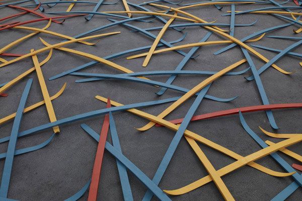 Moulage d’un ski de fond en polyester rouge, bleu-vert et orangé
