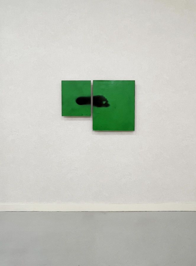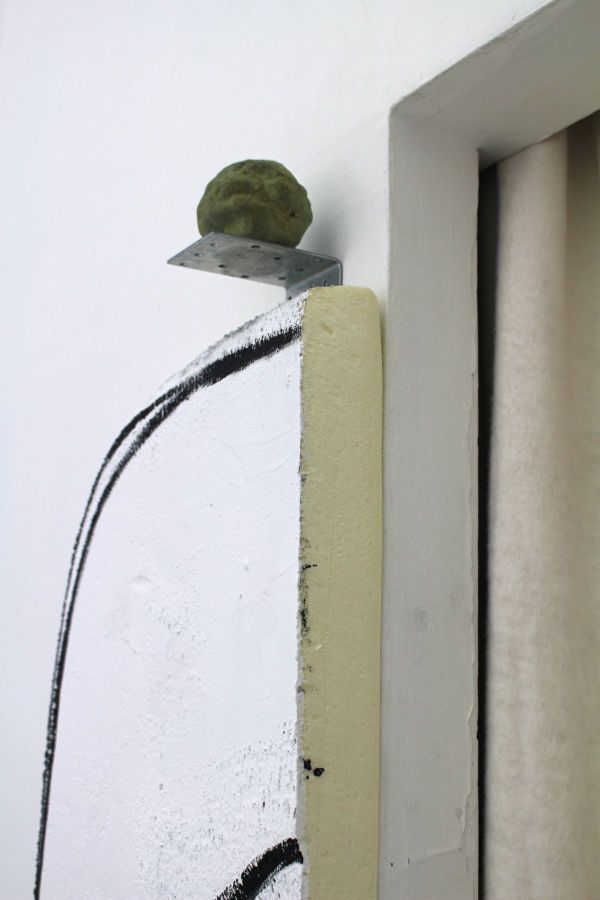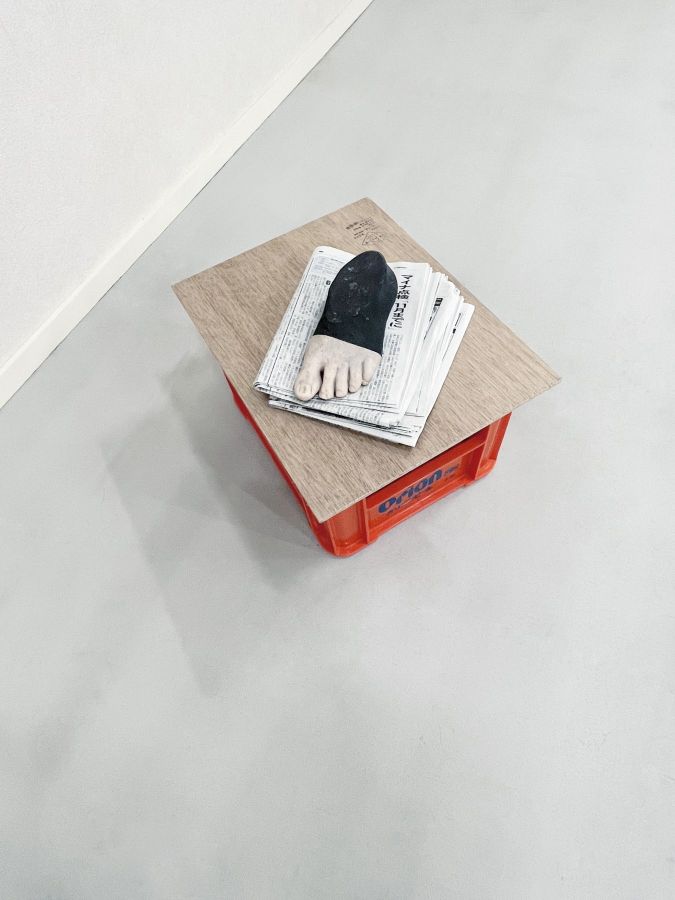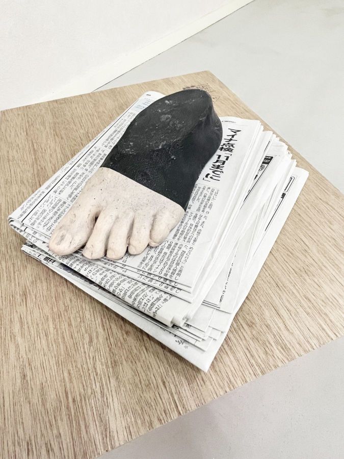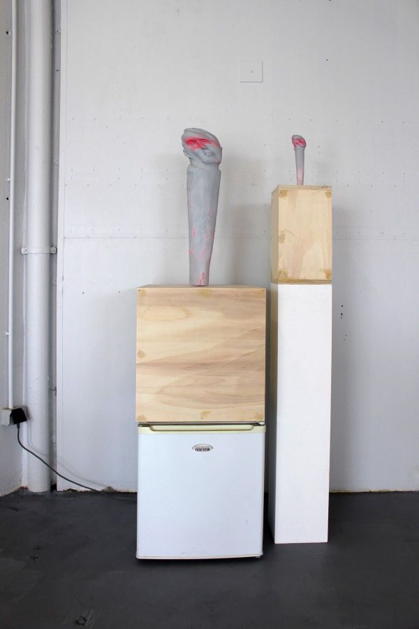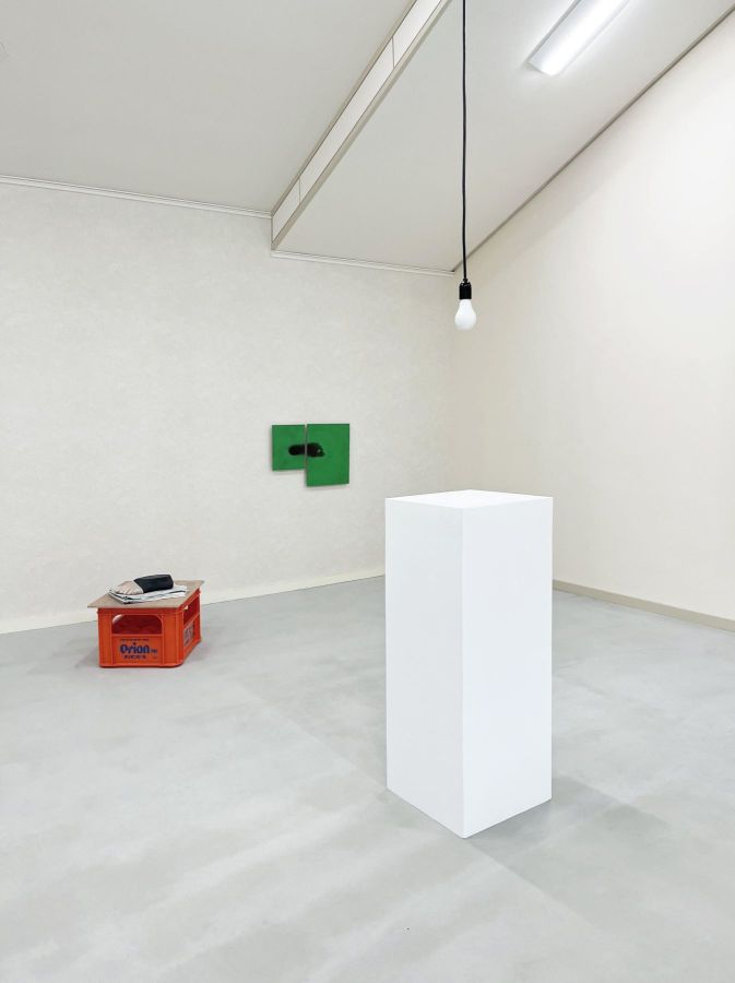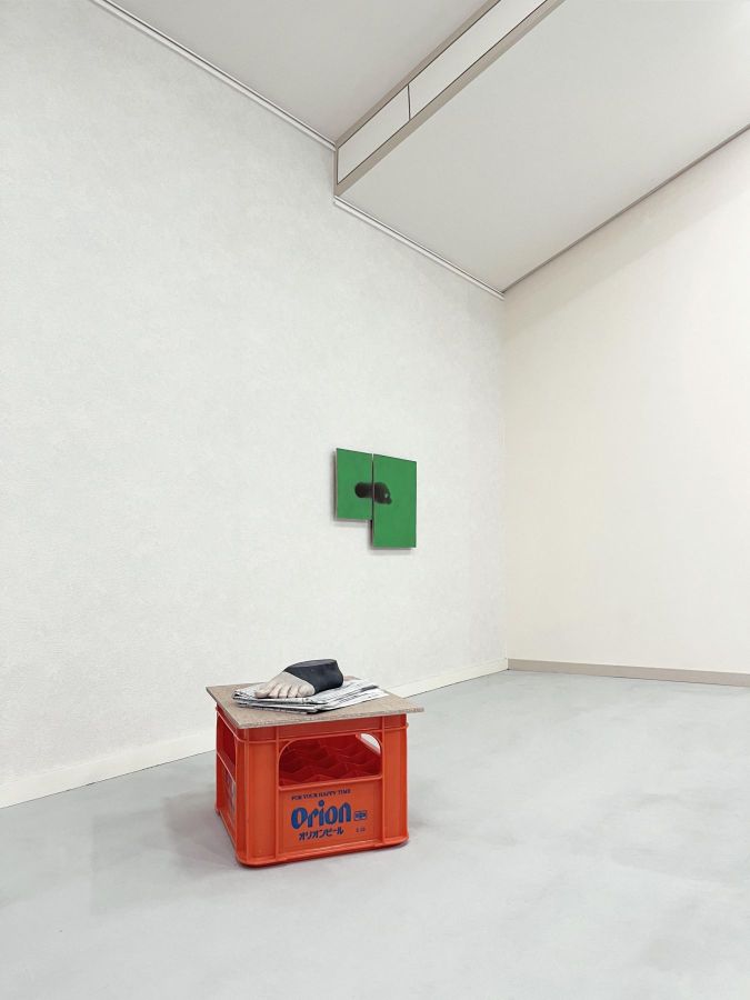 Sculpture en plâtre peint sur socle et peinture sur toile libre, vue de l'exposition In Praise of Shadows - Okinawa
