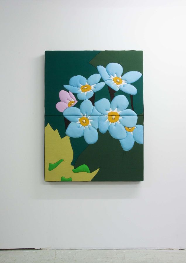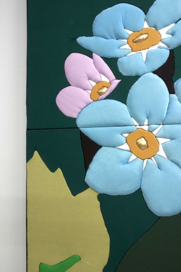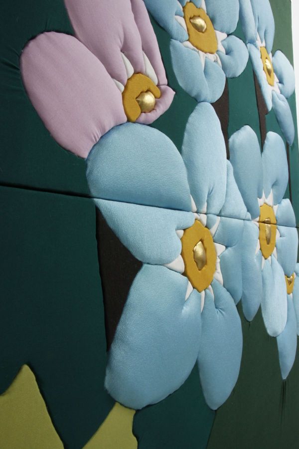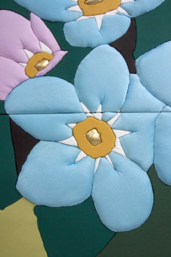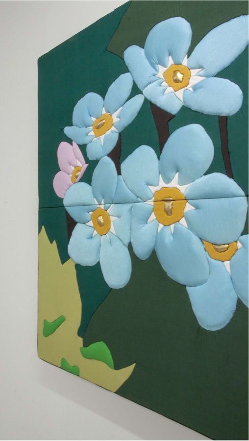Au jardin de Gwenn Mérel est un bas-relief de 2022 réalisé avec du polystyrène extrudé, du tissu et du molleton de polyester. L’aspect décoratif de l’oeuvre est à son paroxysme. Lié à la technique, les matériaux et les couleurs employés (bleu, rose, or), il renvoie aux plantes et aux fleurs artificielles prêtes à remplacer nos chers végétaux. Le textile fait également écho à certains dessins animés ou films de cinéma dont les décors paysagers paradisiaques aux couleurs expressives substituent la réalité à un monde fictif idéalisé. Une transposition critique et effective du vivant vers l’artificiel notamment illustrée dans Alice au pays des Merveilles de Walt Disney et dans Mon oncle de Jacques Tati et son célèbre jardin de la villa moderniste.
