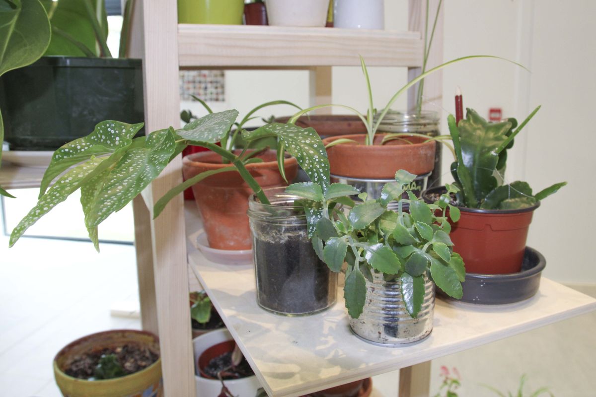 Plantes, étagère en bois, posters à disposition des visiteurs,