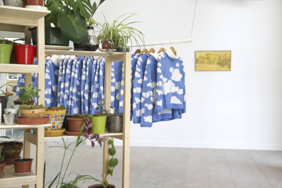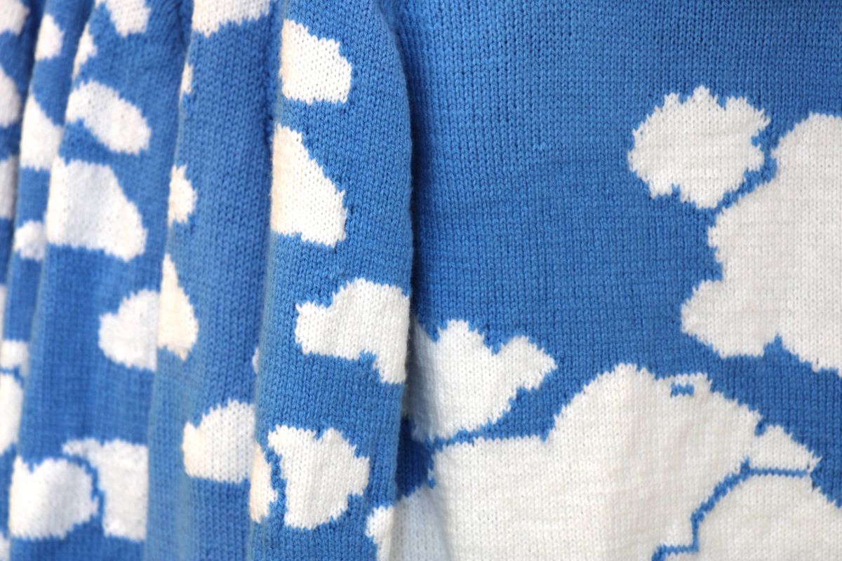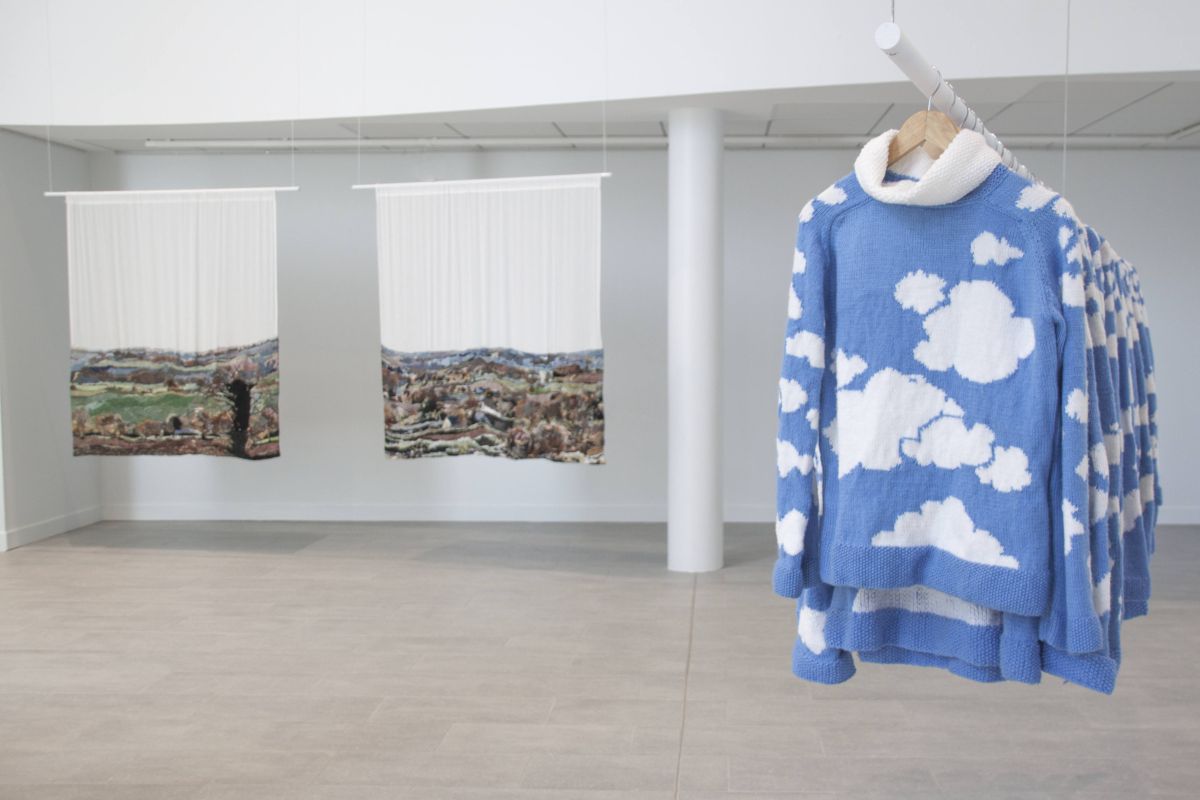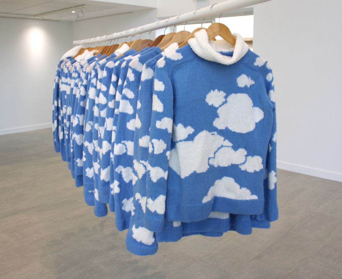 Pulls-nuages, réalisés en tricot main avec un groupe de volontaires, prolongent un savoir-faire collectif dans une temporalité étirée, jusqu’à une performance finale.