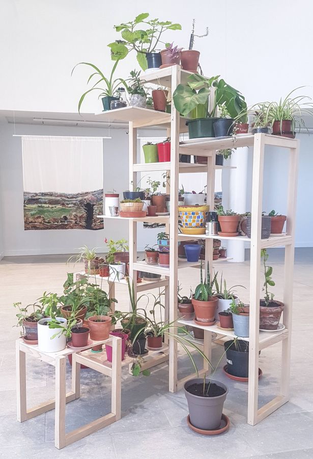 Multiplication végétative provoquée confie des boutures à des personnes engagées dans le projet pendant plusieurs mois : cultivées au quotidien, elles sont documentées puis réunies au vernissage sur un meuble-étagère conçu par l’artiste.