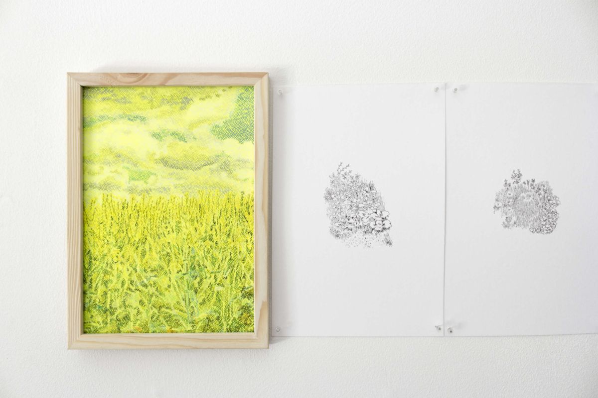 Crayon de couleur sur papier jaune fluo, 14,8 x 21 cm